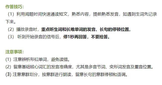 其他:作答的时候,不要抢答。要在开始录音之后才开始回答,切勿在准备时间进行作答。朗读时要清晰大声。发音清晰、声音洪亮、抑扬顿挫的声音是计算机比较偏好的。并且答题的时候不要加太多无关的废话进去。