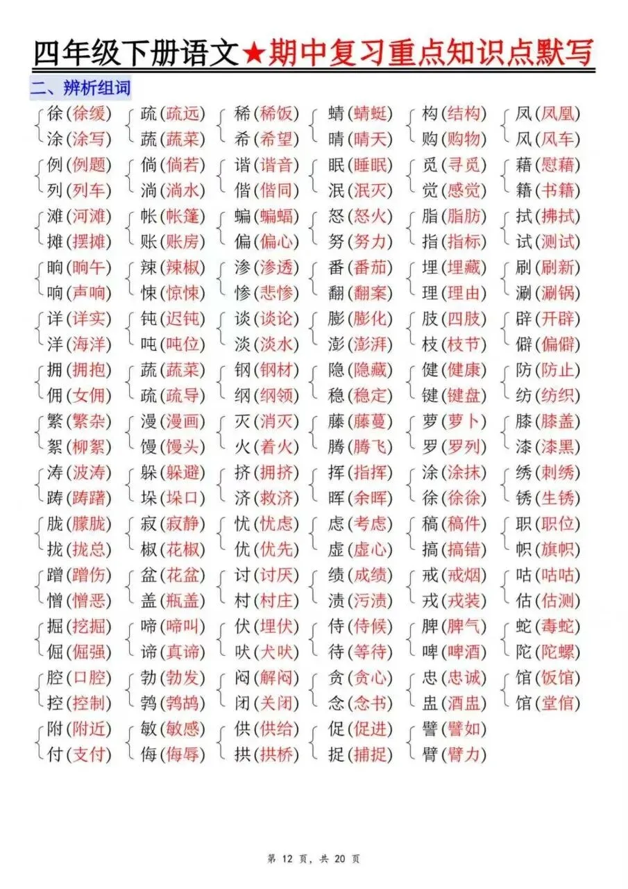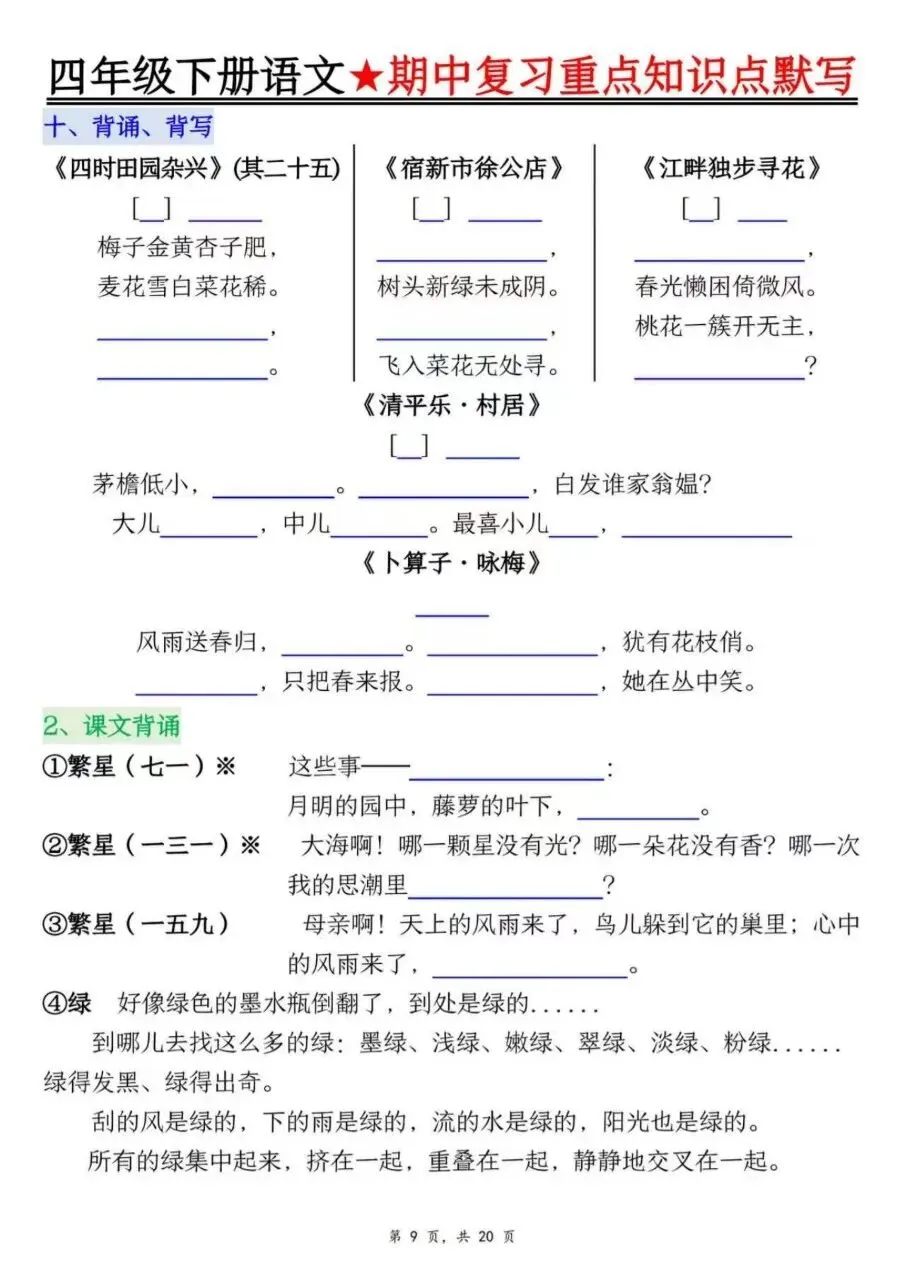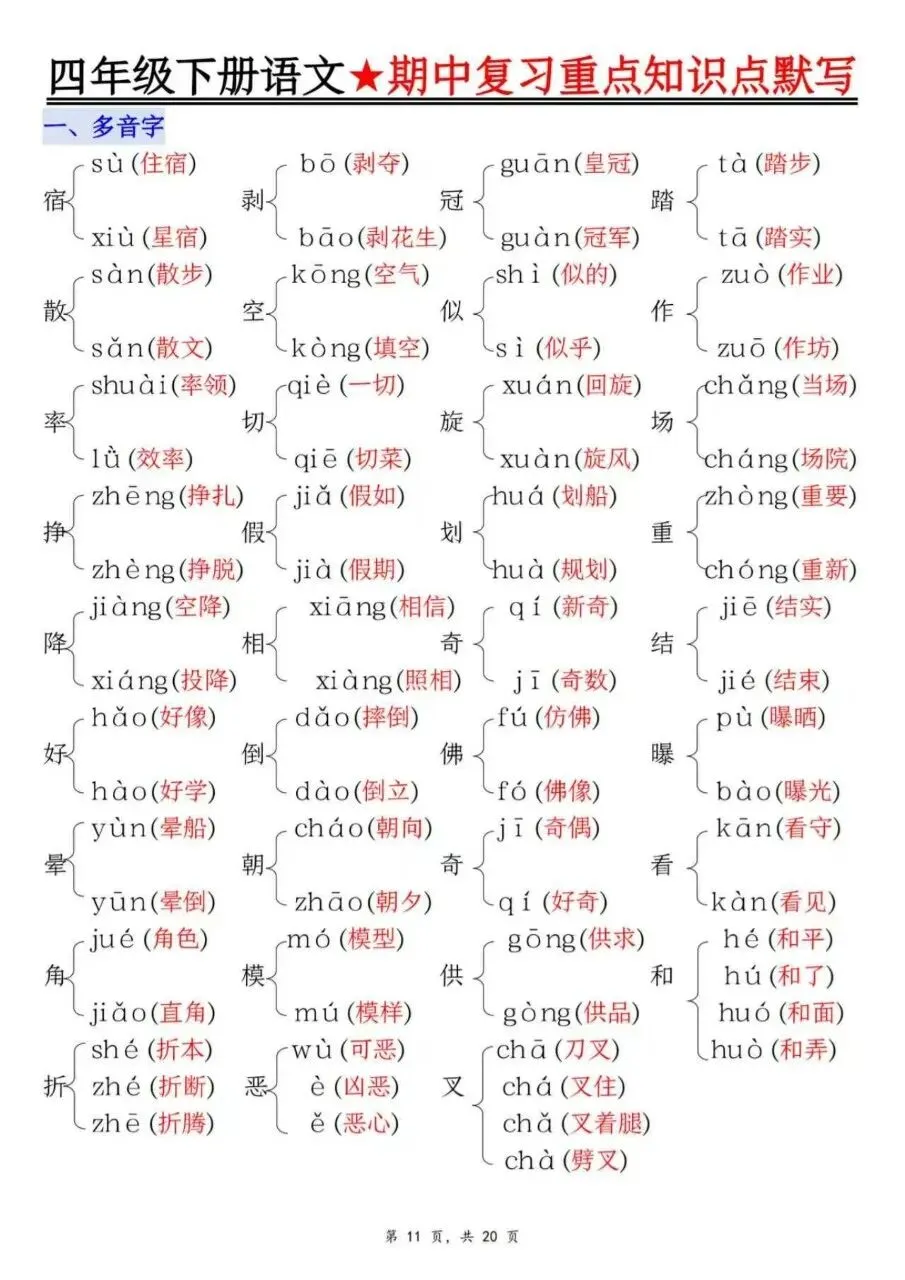 四年级下册语文期中1-4单元复习必考知识点(十大高频考点归纳)