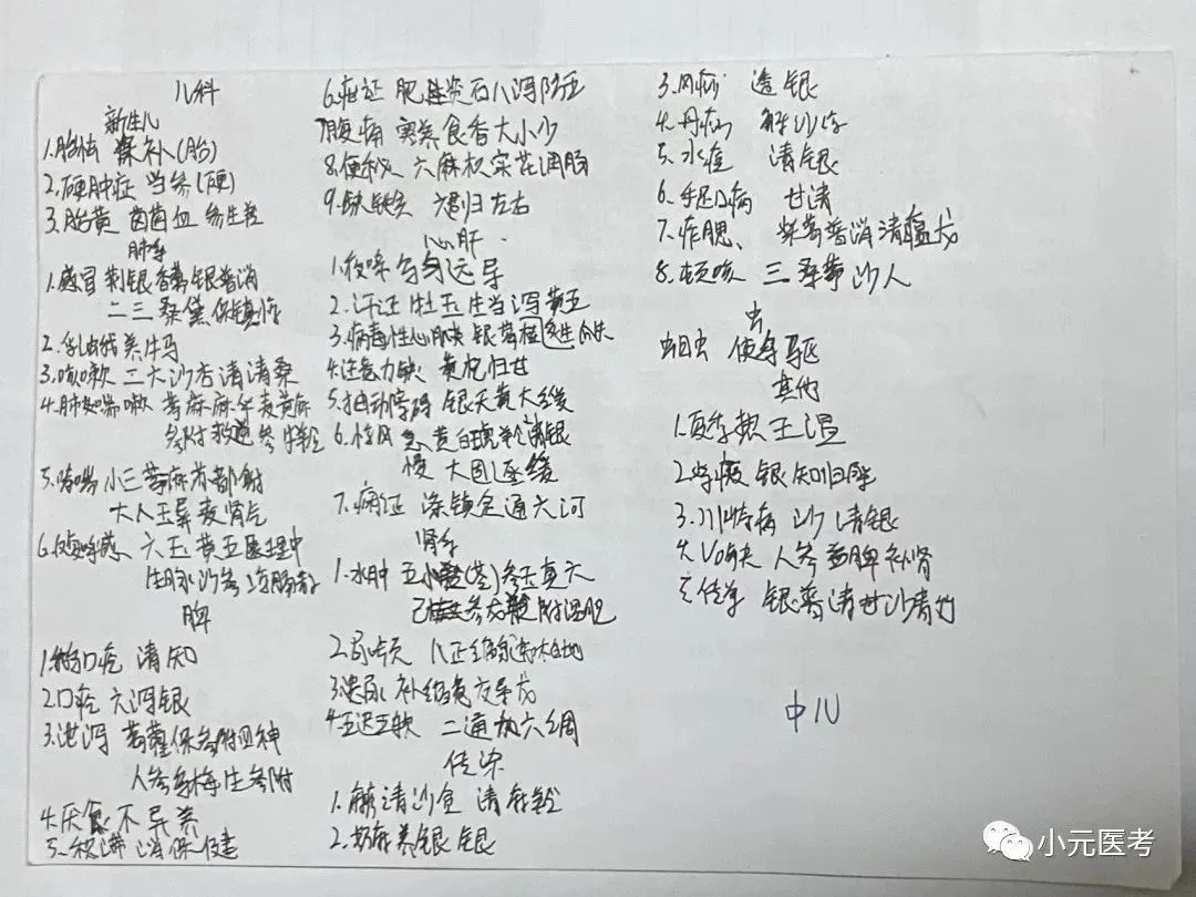 儿科疾病和中内疾病较类似。儿科复习起来也是容易上手的,儿科一些疾病选方和内科疾病选方很相似,在考察中,要突出儿科病的特点,儿科学基础、新生儿疾病、儿科传染病和肺、脾、肾、心肝儿科病证都是重点。在选方上要考虑小儿脏腑娇嫩、病变迅速的特点,注意儿科的常证、变证,选方有所不同。儿科前两单元为总论基础和儿科保健,3-10为各论的具体疾病单元,分别为肺、脾、心肝、肾、传染病(特色重点)、虫证、其他疾病。总论部分:小儿年龄分期、小儿生长发育(身高、体重、囟门、头围、胸围、牙齿、心率、血压运动语言发育)这些也会设置考点,各论部分具体疾病及儿科传染病都是考试重点,主要考察各个疾病辨病、辨证、治法及方剂等。视频参考阿虎潇婷老师视频课,有趣味记忆,方便大家学习记忆。下面放一张儿科病证选方歌诀简洁版笔记,大家可对着复习,具体笔记看以下文章。