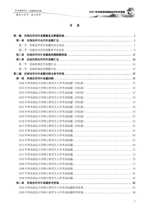 此本民商法学历年真题完整摘录了自2002年至2026年的华政考研民商专业真题,其中历年真题参考答案给出了真题的【参考答案】,以及真题相关的【考题评析】,让各位考生明确每一年的真题中对应考点的出处,以及考试的形式,试题的难易等信息。但各位考生需要注意的是,学长所给出的参考答案并不是在考试中你必须写得完全一样的答题规范,也就是说各位考生写在考卷上的内容可以根据参考答案适当增加或减少,因此各位考生千万不要把参考答案作为答题的唯一标准。