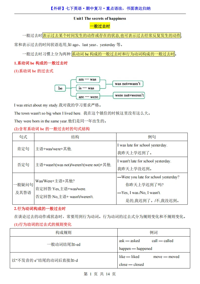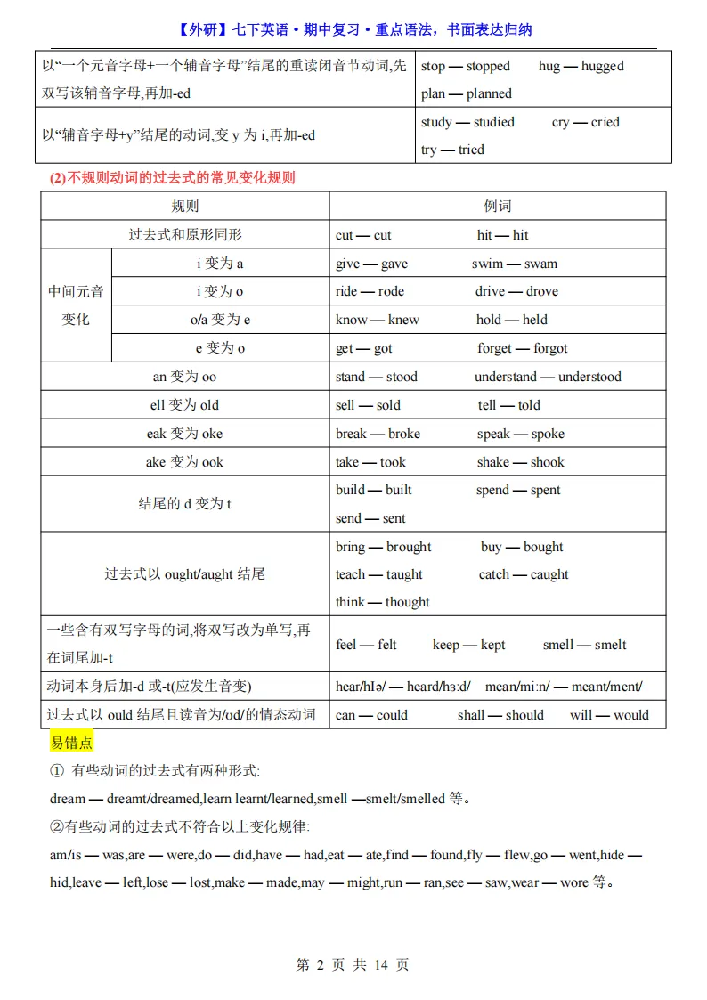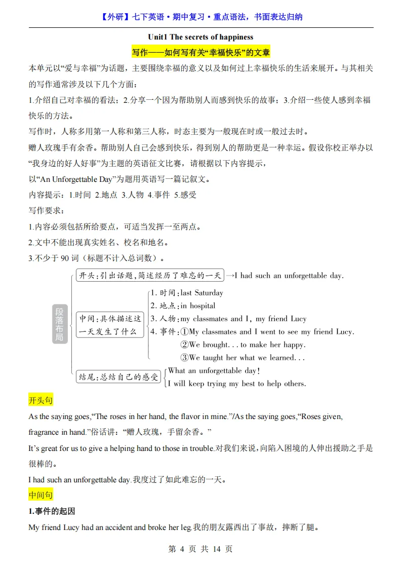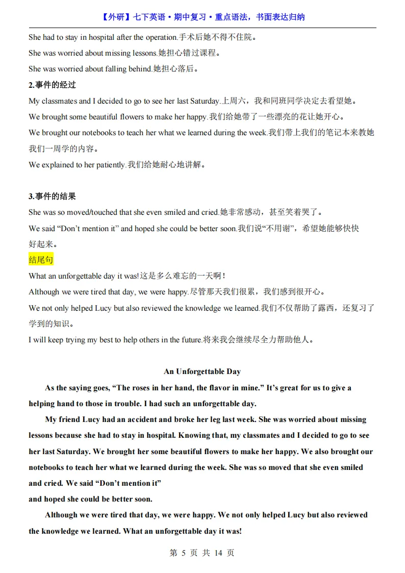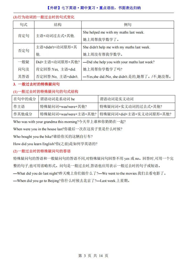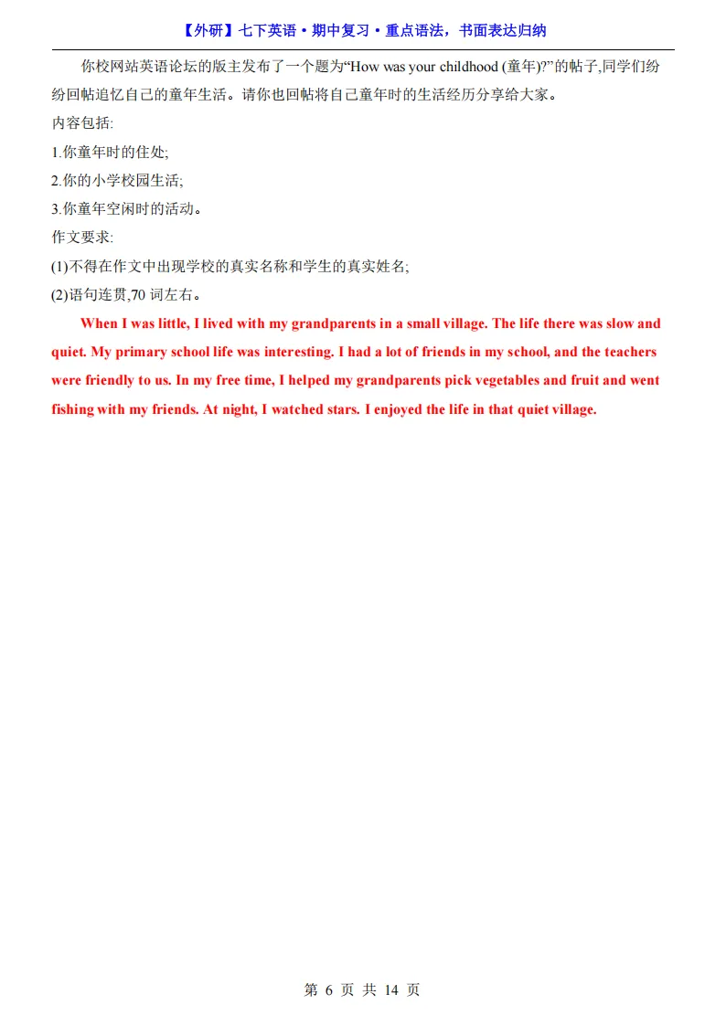 专项练习 I 七年级(下)英语期中复习重点语法,书面表达归纳(外研版) 电子版可下载打印