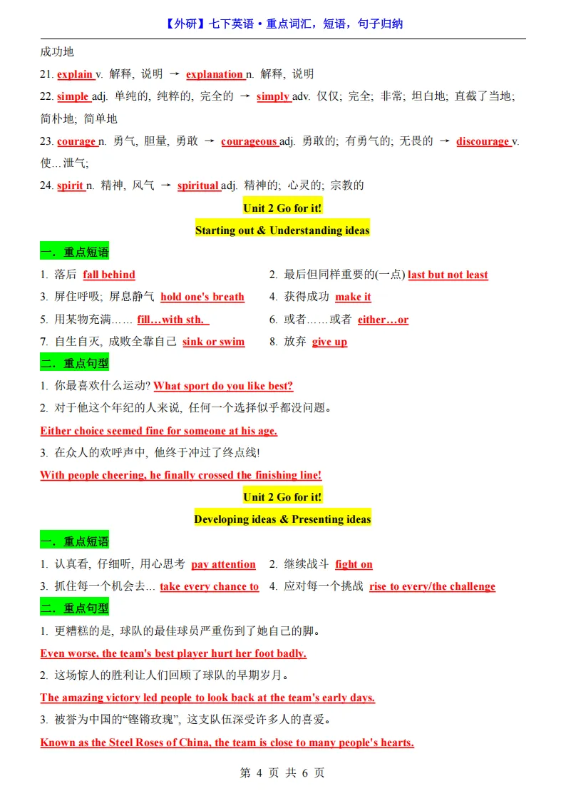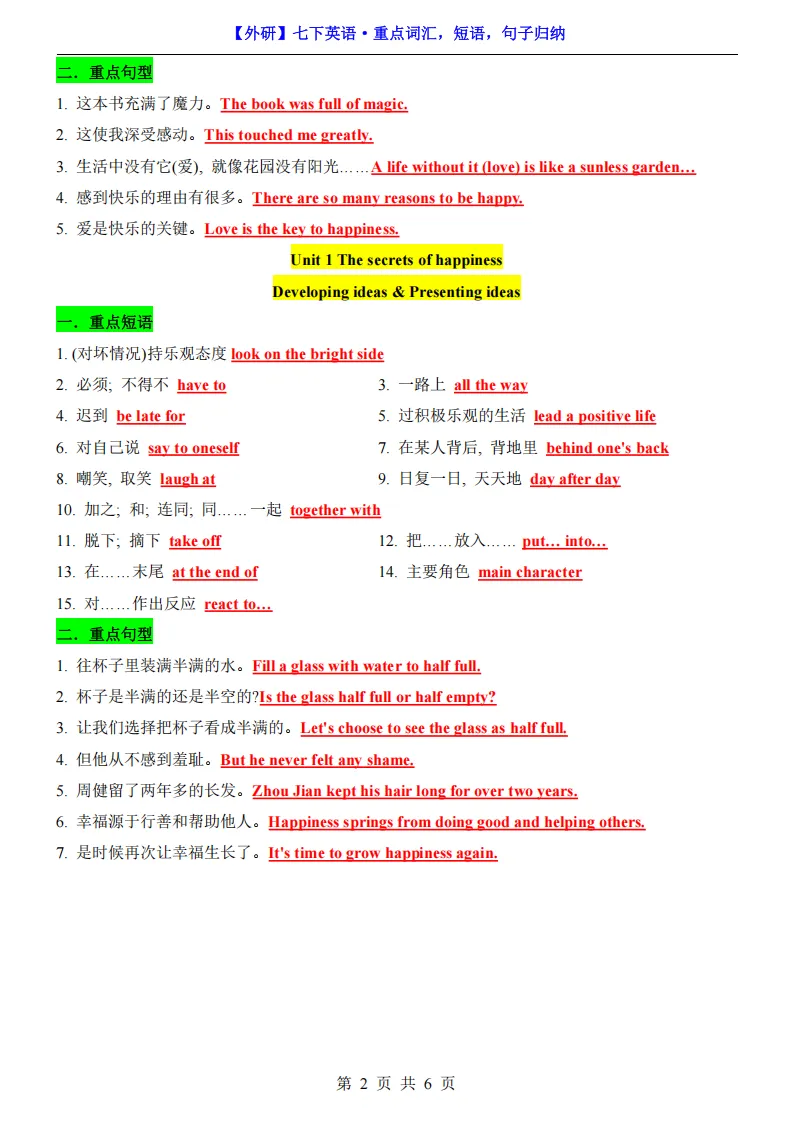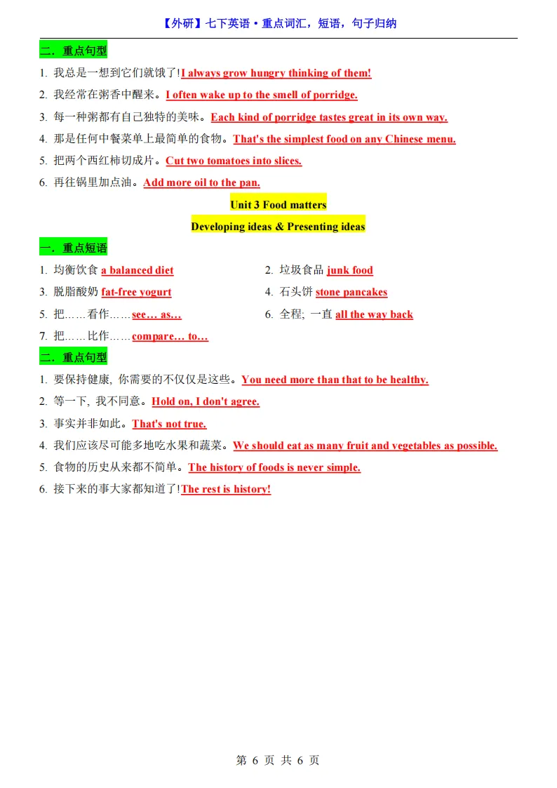 专项练习 I 七年级(下)英语期中复习重点词汇,短语,句子归纳(外研版) 电子版可下载打印