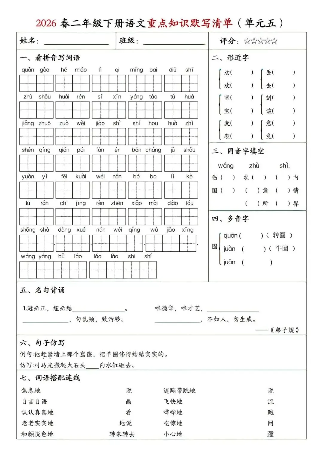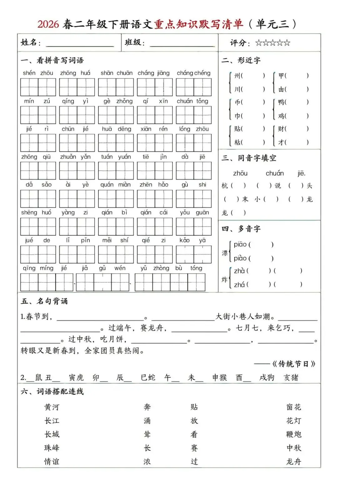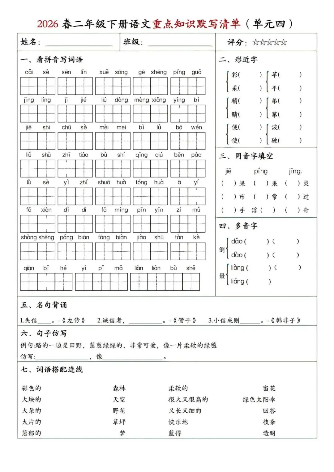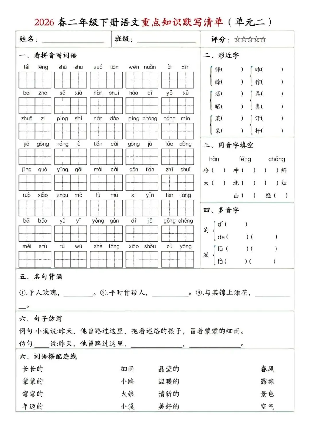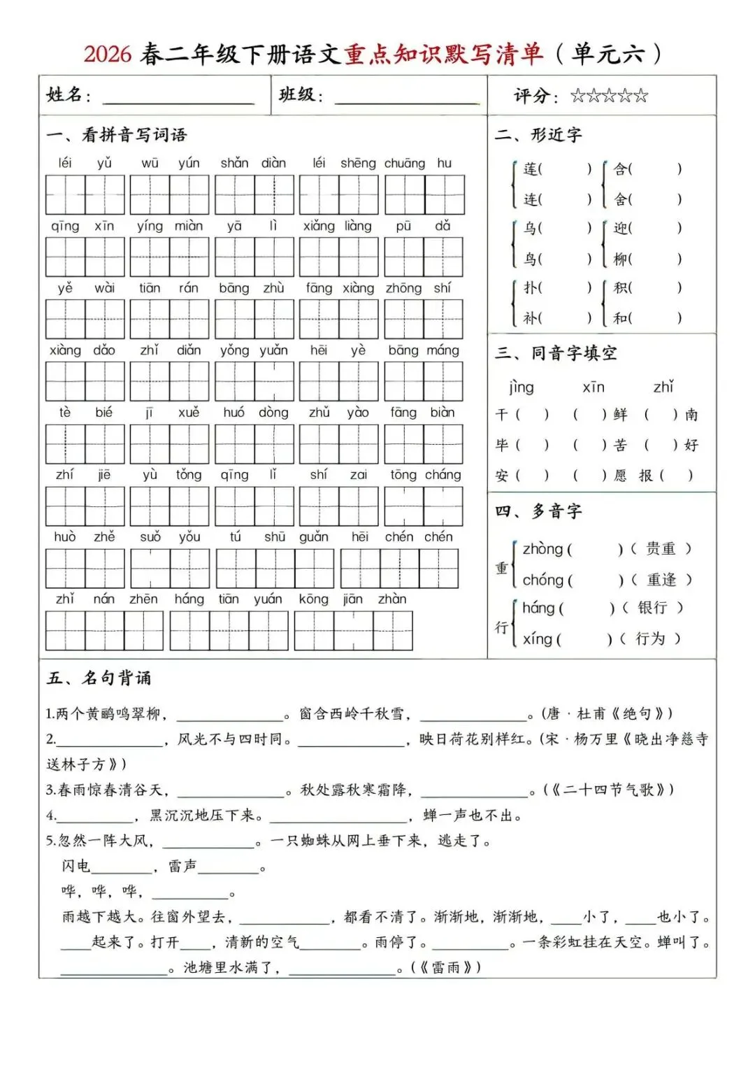 2026春部编版二年级下册语文重点知识默写清单,看拼音写词语、形近字、多音字、必背古诗名句一站式整理,练完基础更牢固~电子版可打印~①:点一点右下角的“赞”和“在看”,感谢