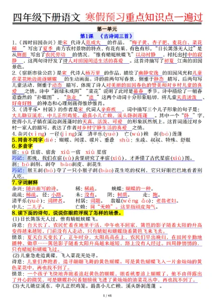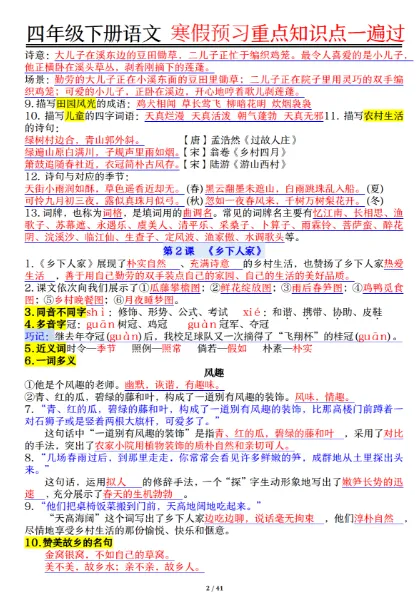 四年级(下)语文 期末复习重点知识点一遍过,PDF电子版,可打印,免费下载