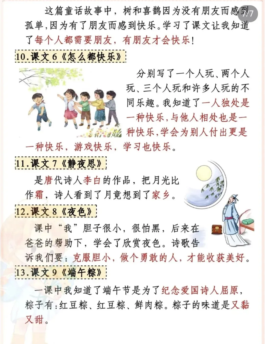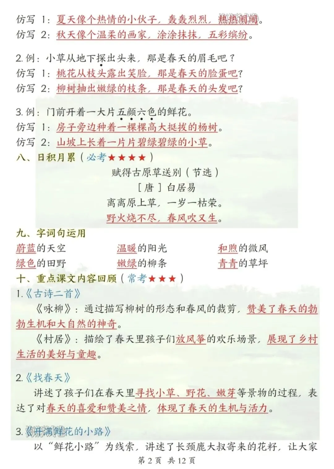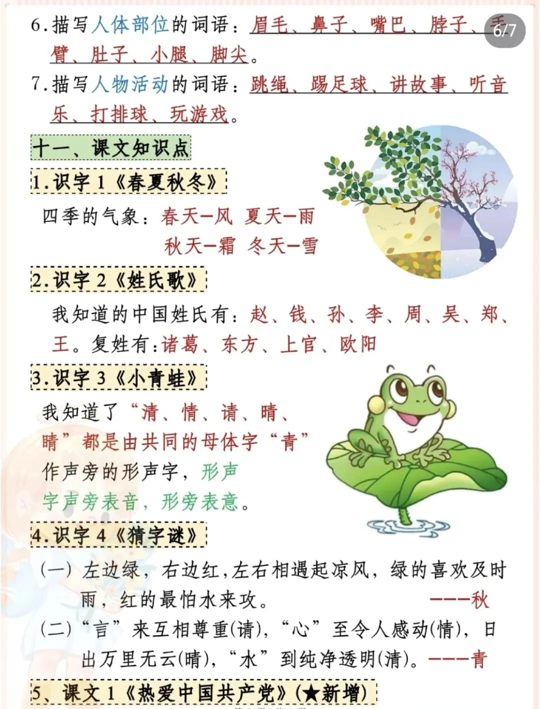 ✅ 课文核心知识点梳理(《春夏秋冬》《姓氏歌》《树和喜鹊》等);