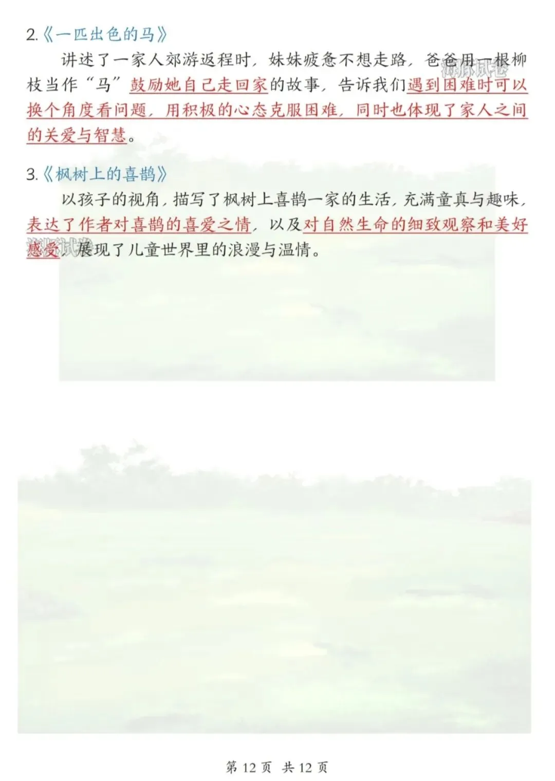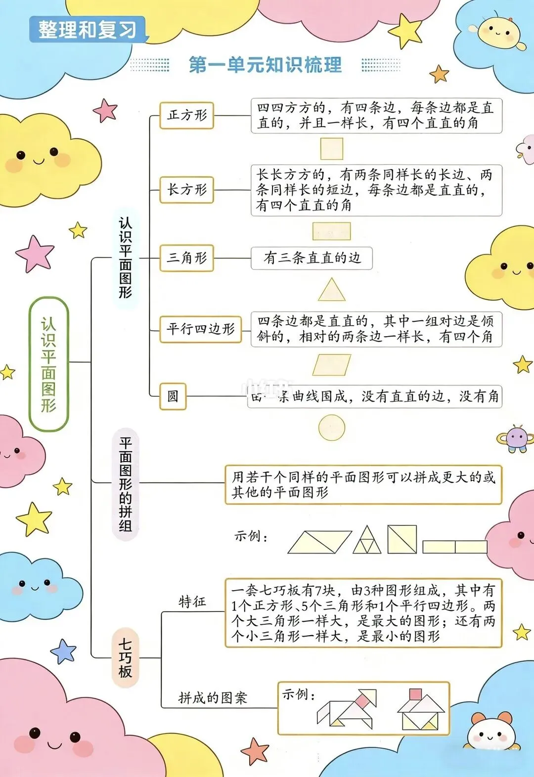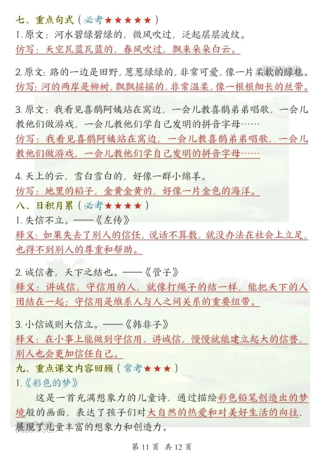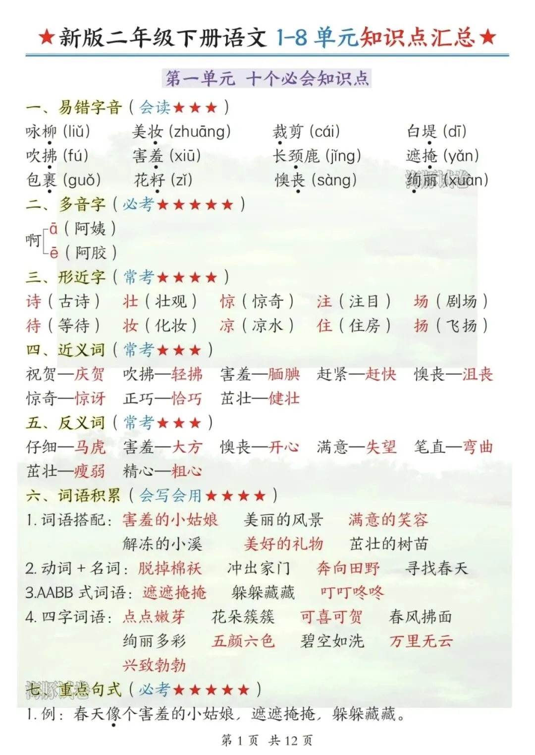 ✅ 课文核心知识点梳理(《春夏秋冬》《姓氏歌》《树和喜鹊》等);