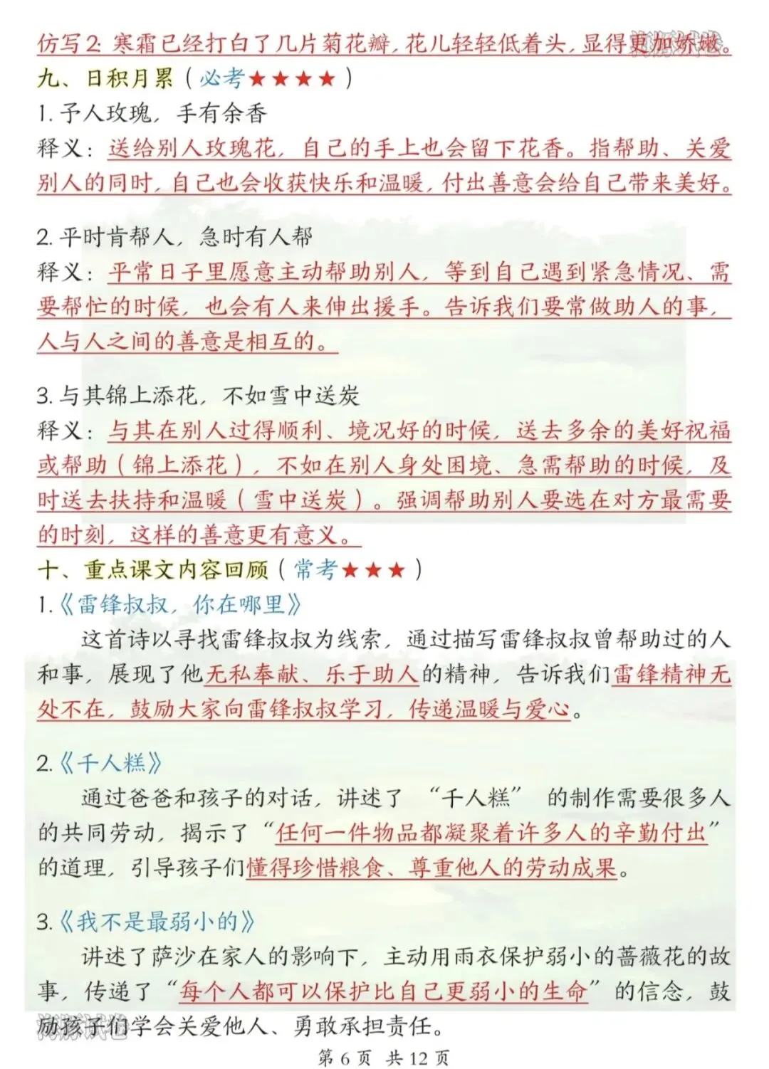 ✅ 重点课文内容回顾(《雷锋叔叔,你在哪里》《千人糕》《神州谣》等);