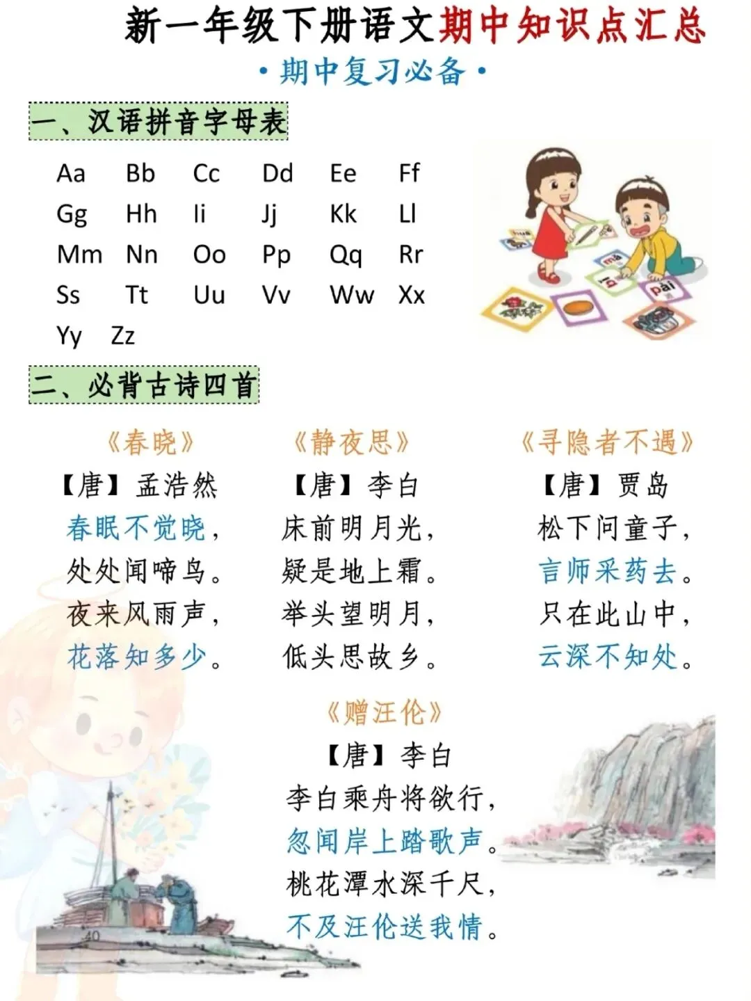 ✅ 必背古诗四首:《春晓》《静夜思》《寻隐者不遇》《赠汪伦》;