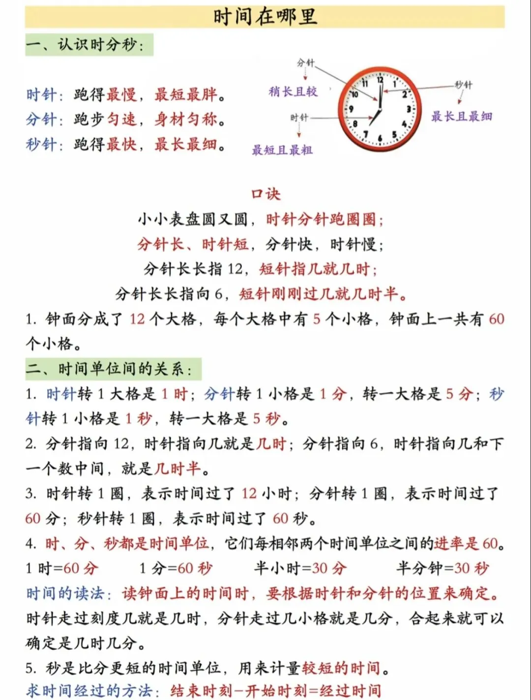 ✅ 时间单位(时、分、秒的认识、进率、钟表认读)。
