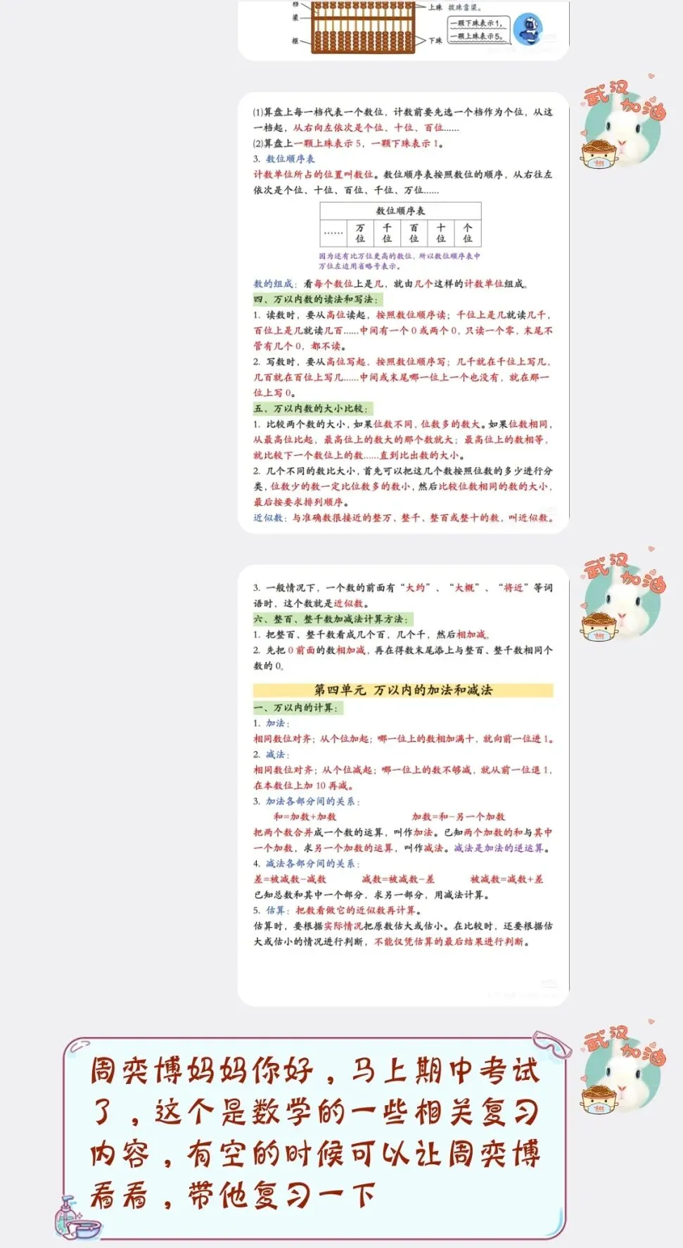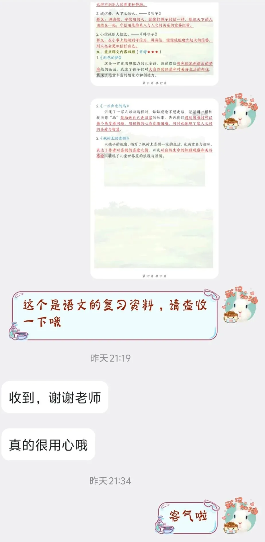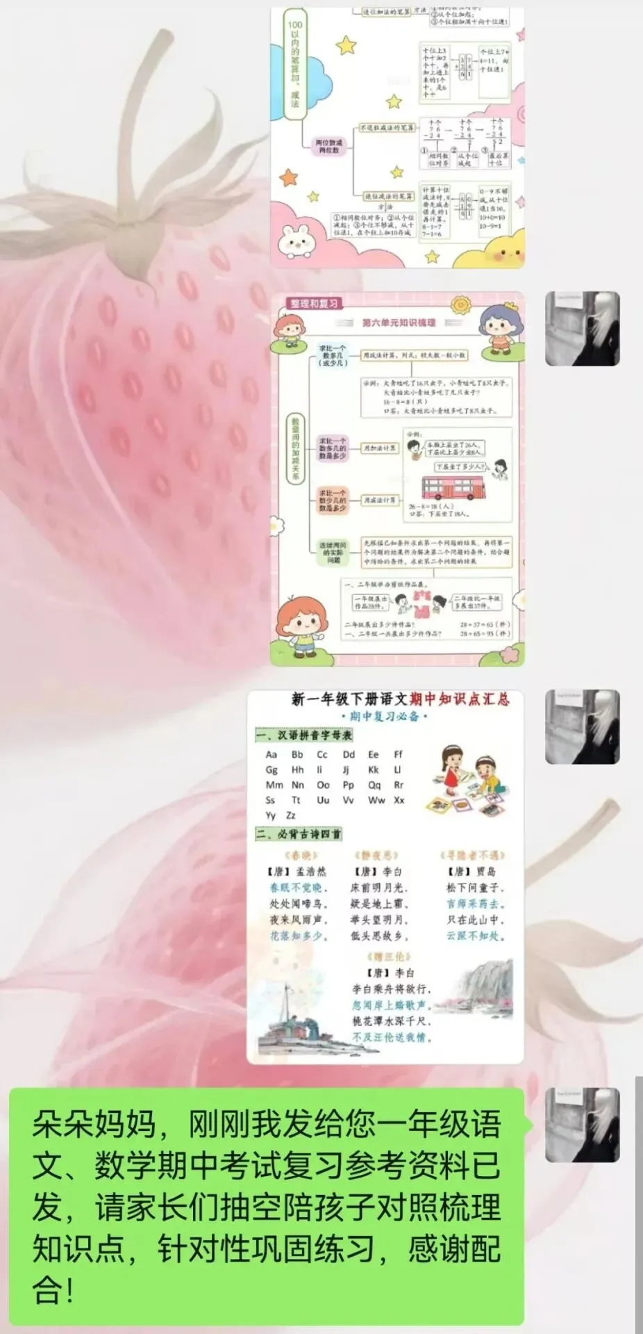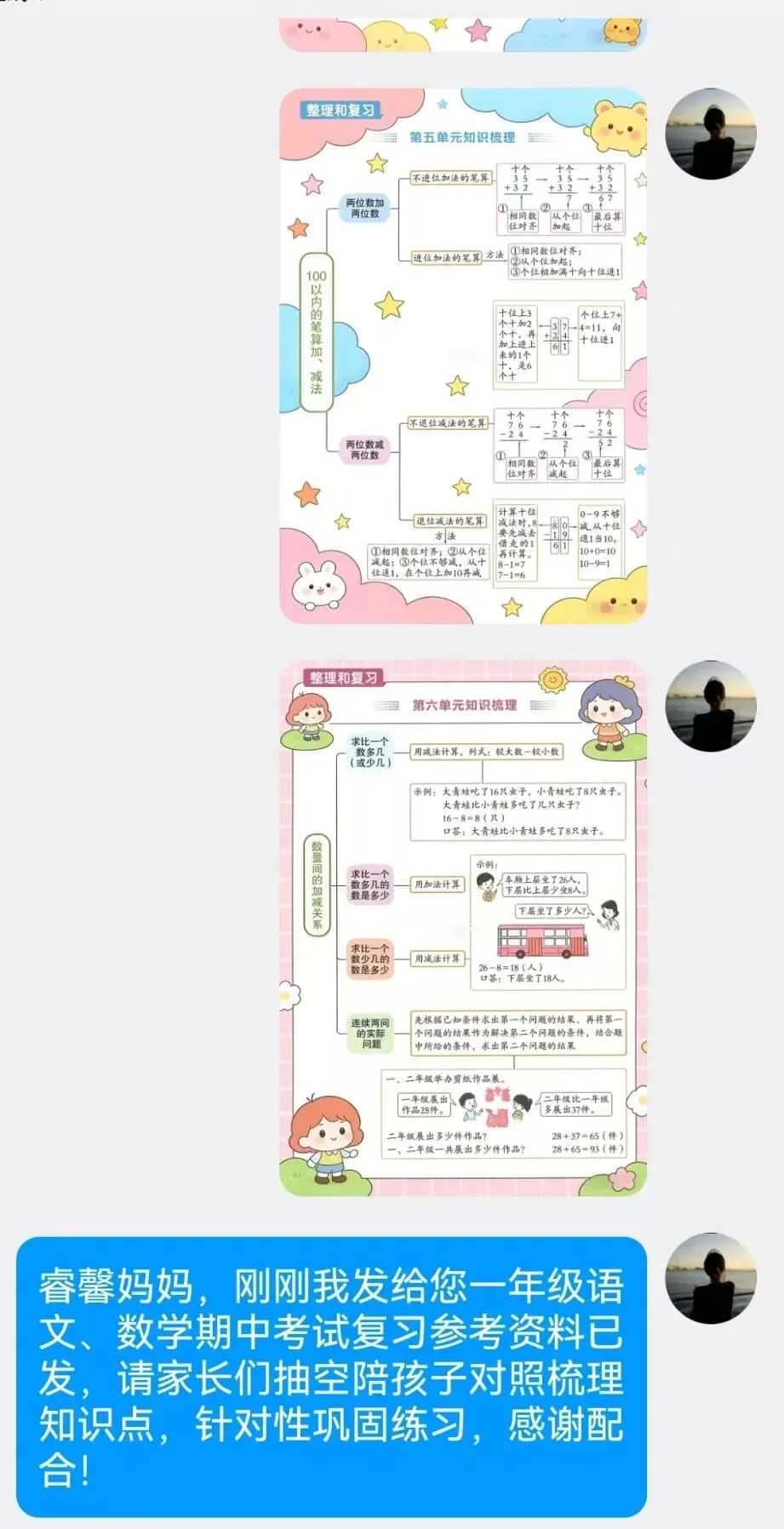 各年级各科复习材料已发送至家长,托管建议: