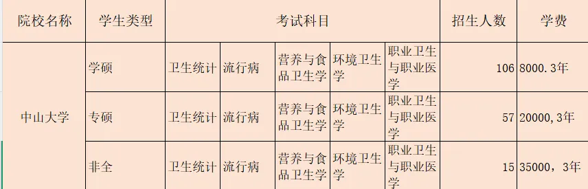 2026年中山大学全日制专硕共招生57人,推免18人,统招39人,每年招生人数还是比较多且稳定的,加之我家里人都更偏向于在广东生活,所以考虑之后 —— 决定报考中山大学。专业课的题型参照2026年中大公卫考研大纲,题型为选择题75个,简答题6个,论述题6个;每年的中大公卫专硕分数线基本在307左右,进入复试还是比较简单的,然后每年逆袭的也很多。