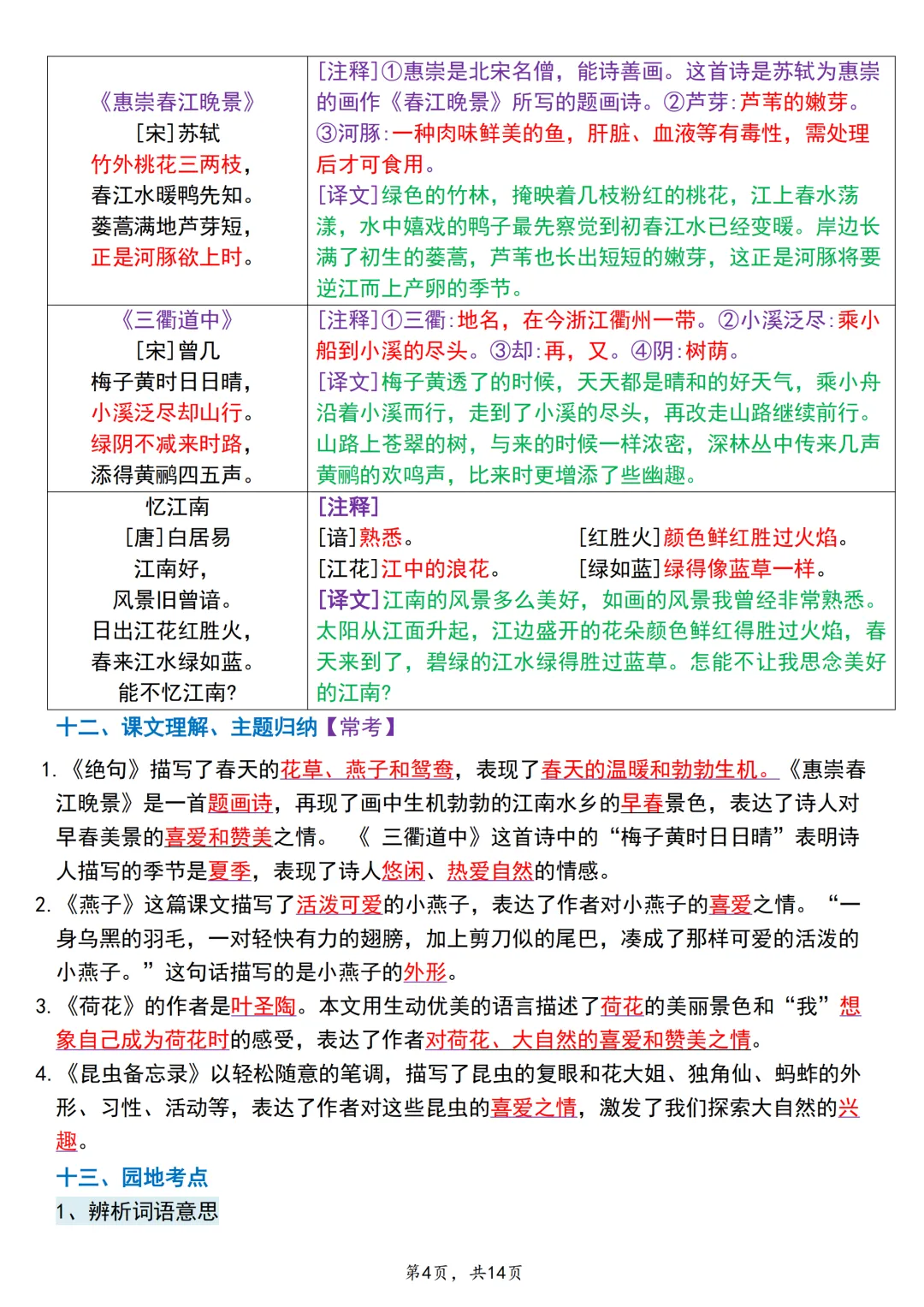 26 春三年级语文下册《期中复习 1-4 单元考点背记汇总》整理完毕!涵盖生字词、多音字、形近字、近义词反义词、四字词语、成语运用;包含课文重点句段、中心思想、古诗日积月累、必背内容、句子考点;按单元归纳,条理清晰、重点突出,适合晨读背诵、考前突击,基础不丢分,期中更稳💯