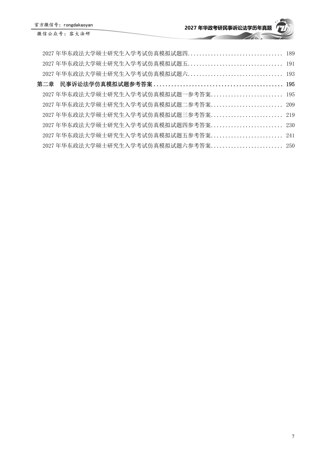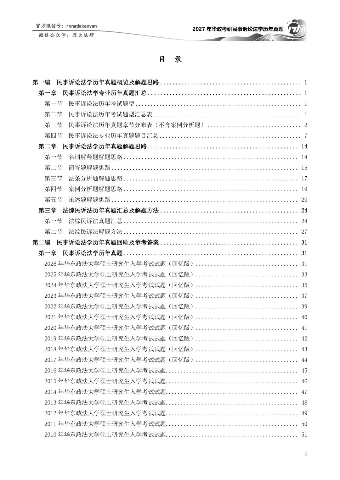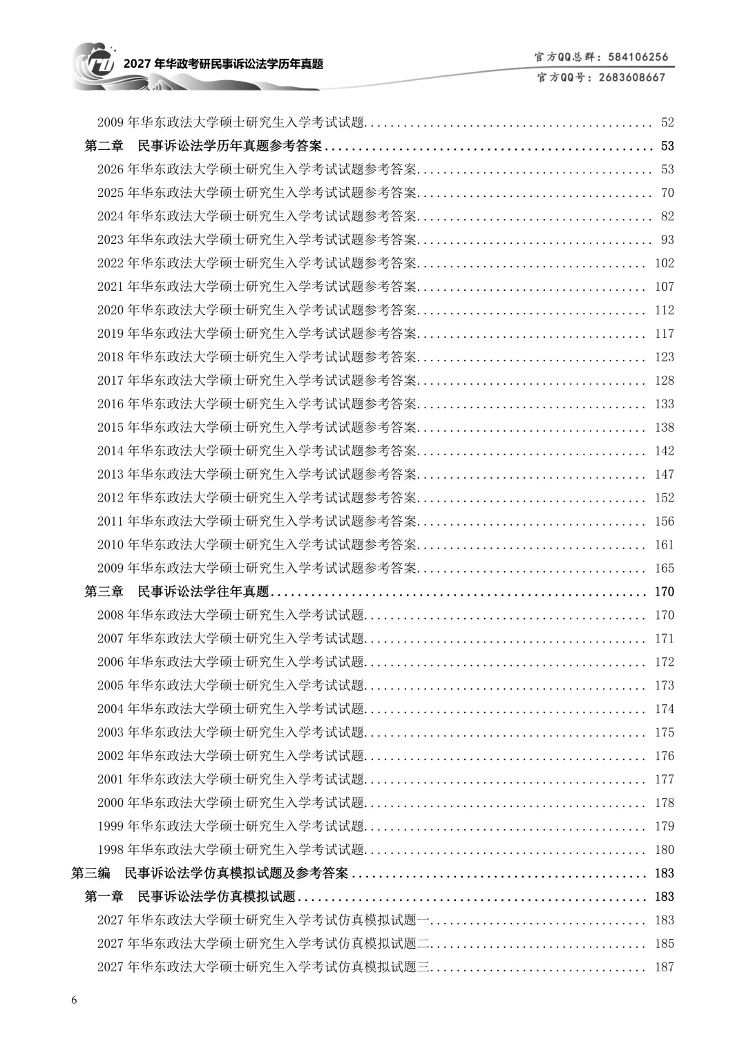 此本历年真题完整摘录了自2002年至2026年的华政考研民诉专业真题,其中历年真题参考答案给出了真题的【参考答案】,以及真题相关的【考题评析】,让各位考生明确每一年的真题中对应考点的出处,以及考试的形式,试题的难易等信息。但各位考生需要注意的是,学长所给出的参考答案并不是在考试中你必须写得完全一样的答题规范,也就是说各位考生写在考卷上的内容可以根据参考答案适当增加或减少,因此各位考生千万不要把参考答案作为答题的唯一标准。