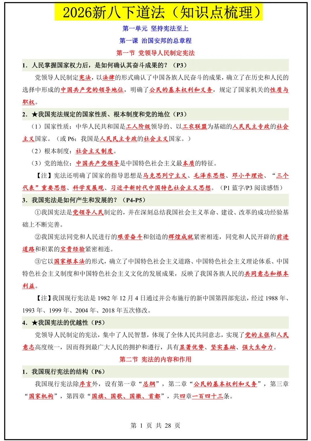 26 春初中八年级下册道德与法治《全册核心知识点梳理清单》期中期末复习必背来啦✨紧扣教材大纲,梳理宪法、公民权利与义务、国家机构、基本制度等全册核心考点,条理清晰、重点突出,全是必背干货。按考点归纳整理,方便背诵记忆,适合期中、期末考前快速复习,背诵效率翻倍,道法考试轻松提分💯