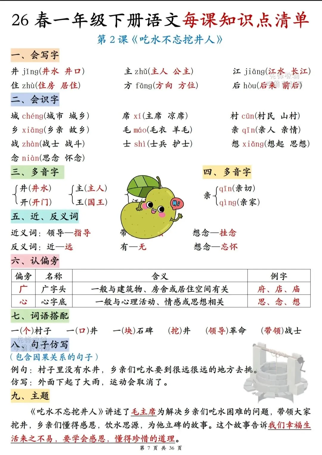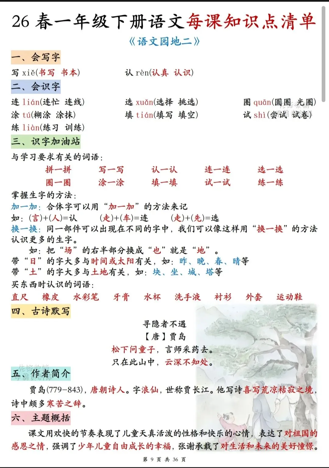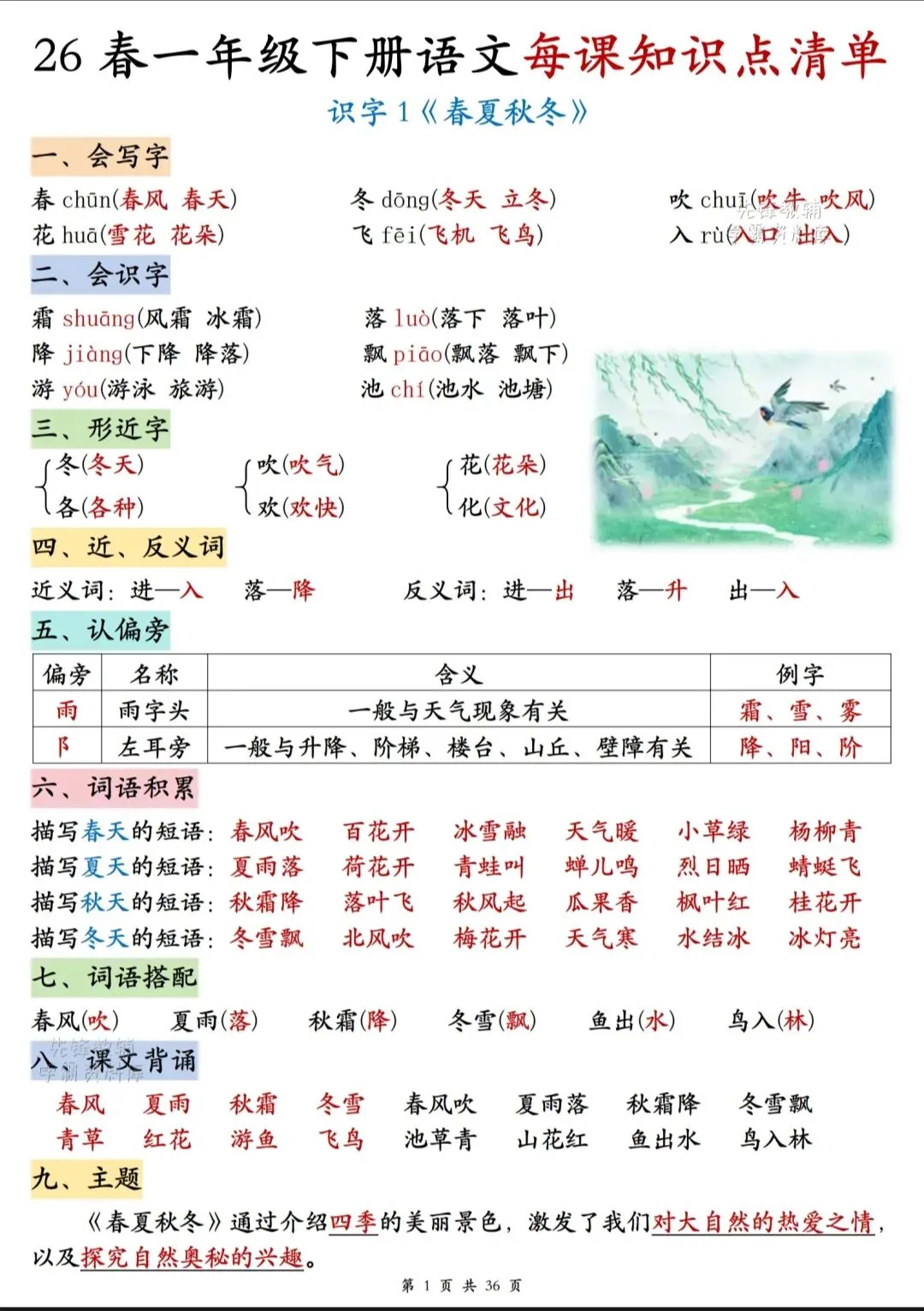 马上期中考试了,这份一年级下册语文每课知识清单,赶快打印出来,让孩子背一背,记一记吧!