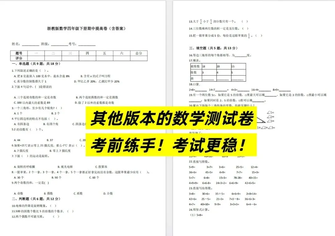 除了沪教版,我们还收集了人教和浙教版本的1-6年级数学真题卷,可以给孩子们练练手——