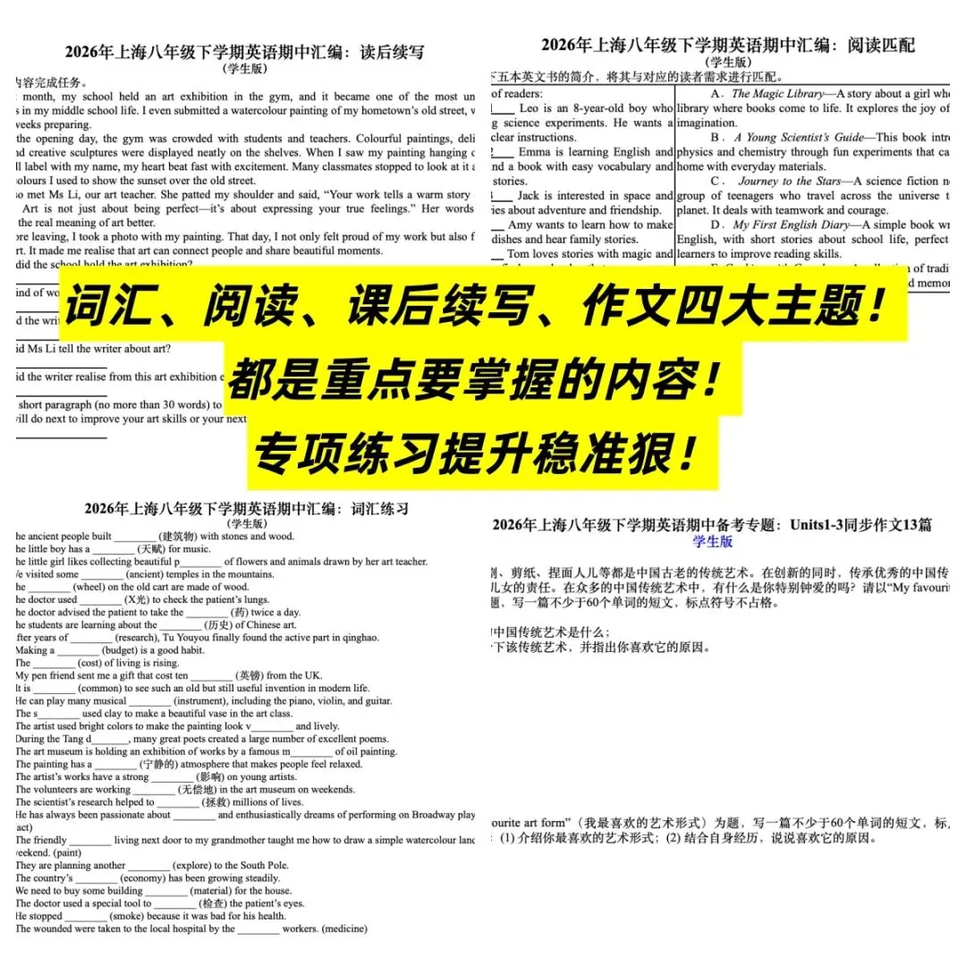 八年级则是针对性给到了词汇、阅读、课后续写、作文四大主题!都是很实用的干货啊,只有童嘉有这么强大的资料库——
