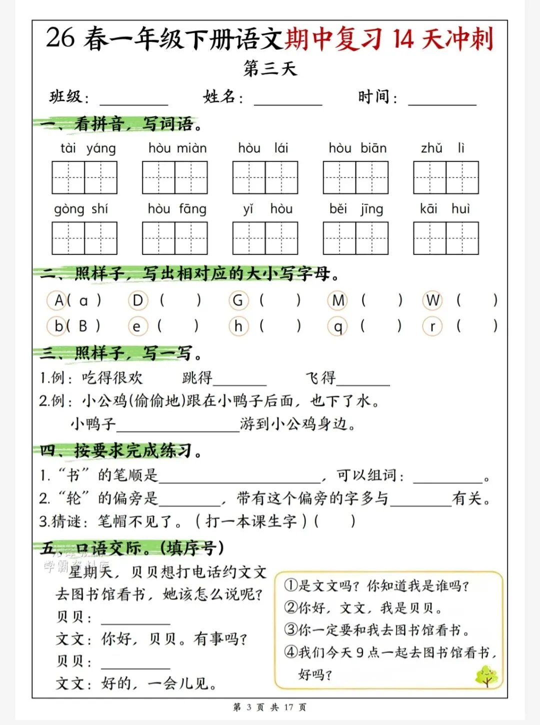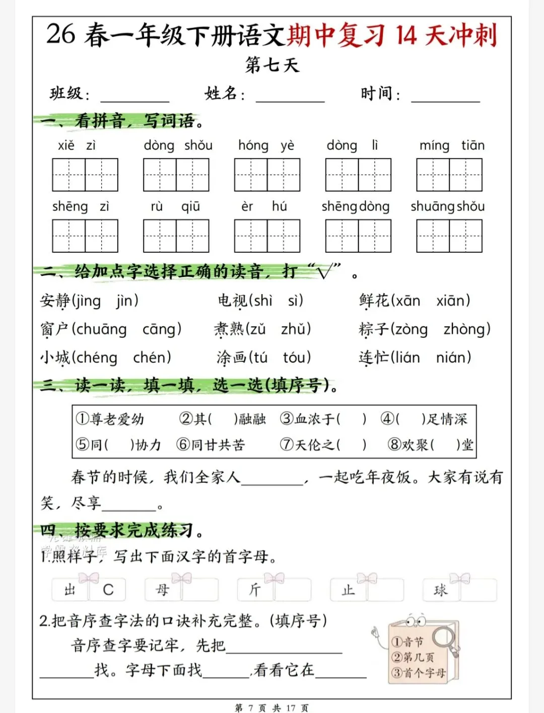 今天给大家整理了26春一年级下册语文期中复习14天冲刺完整版,转发给朋友或班级群,受益更多人,帮助孩子学习!