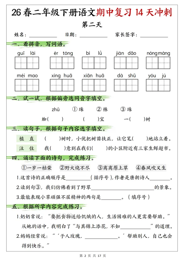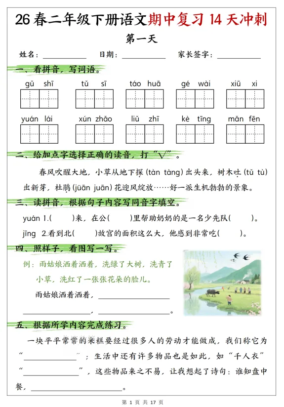 【小学资料】26春《语文期中复习14天冲刺》1-6年级下,电子版,可下载打印