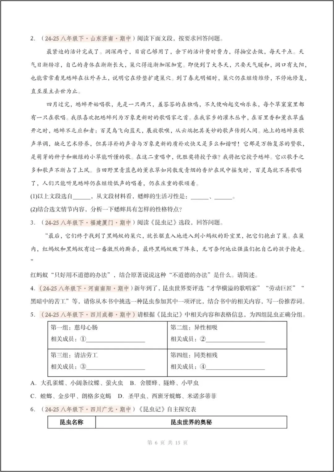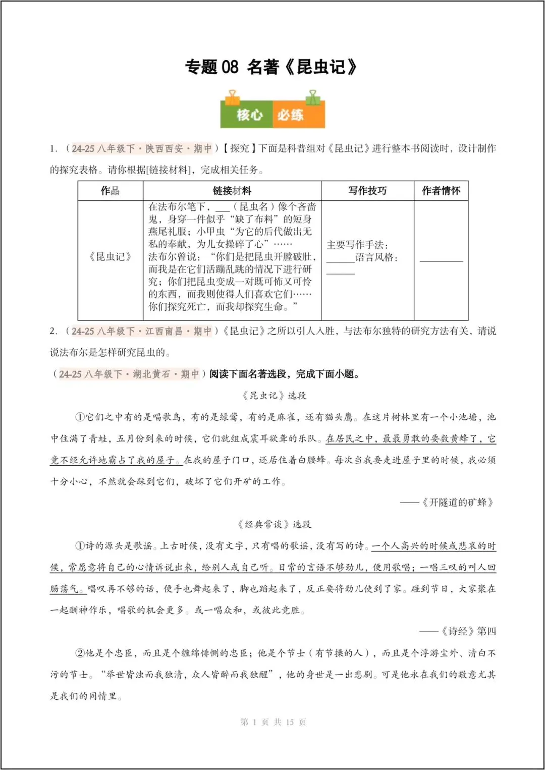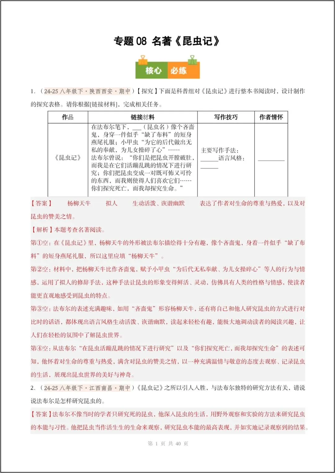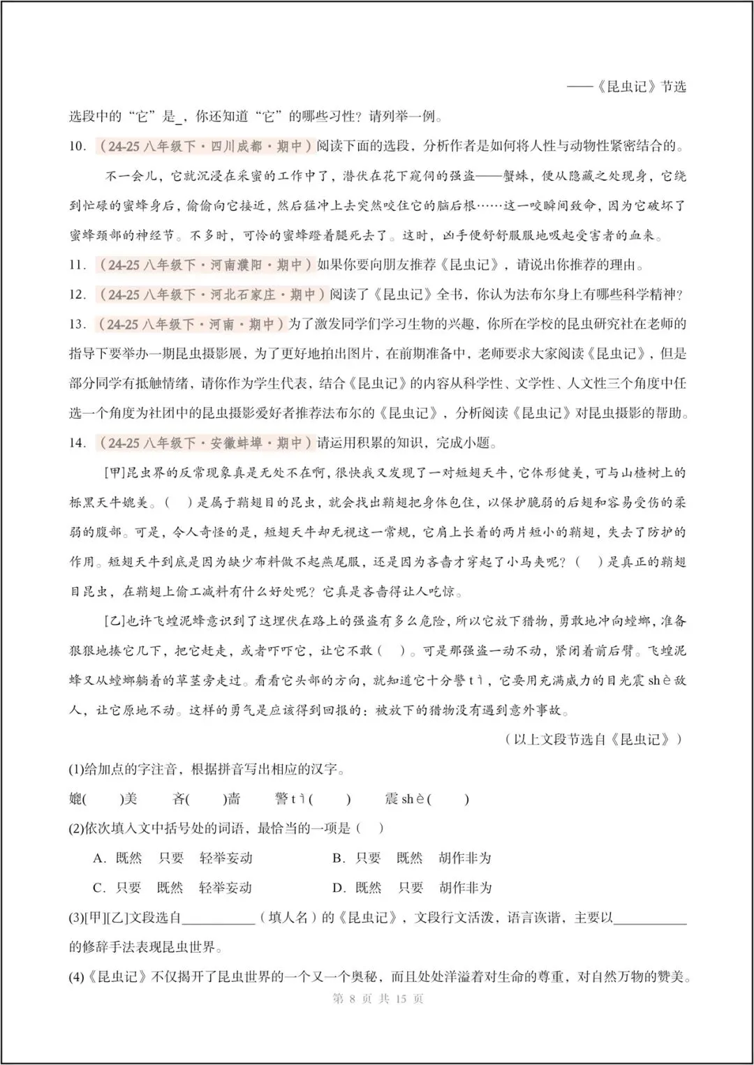 期中复习资料|2026新人教版八年级下册语文 名著《昆虫记》(期中真题汇编)(考点梳理,熟记)附答案解析电子版可打印!