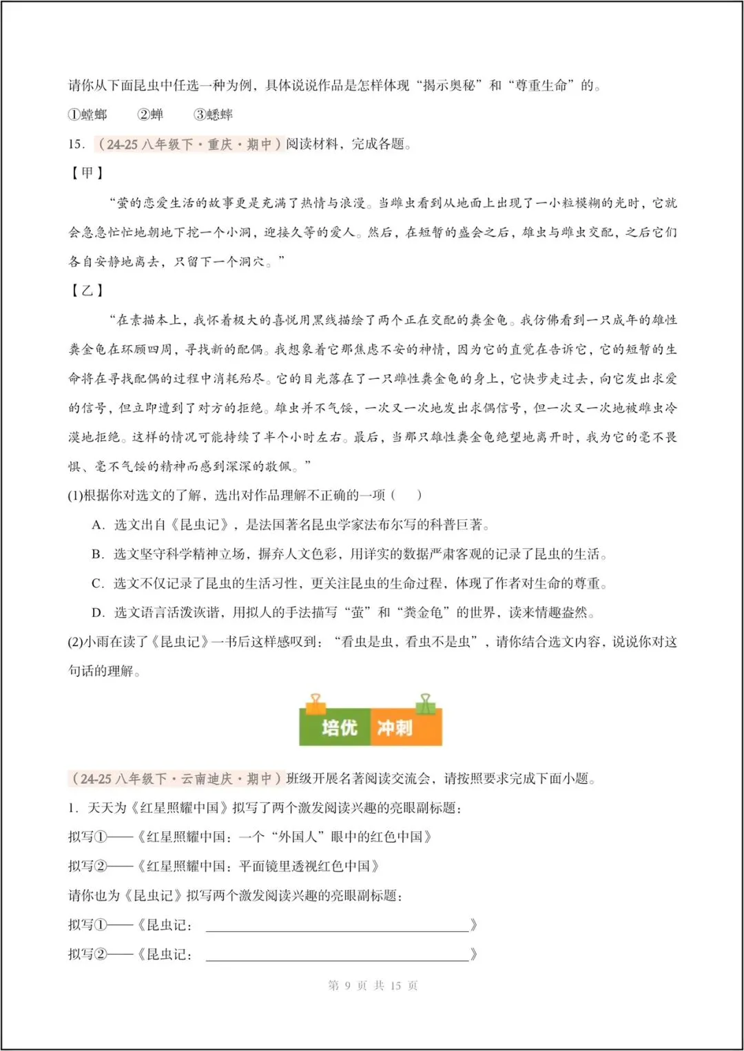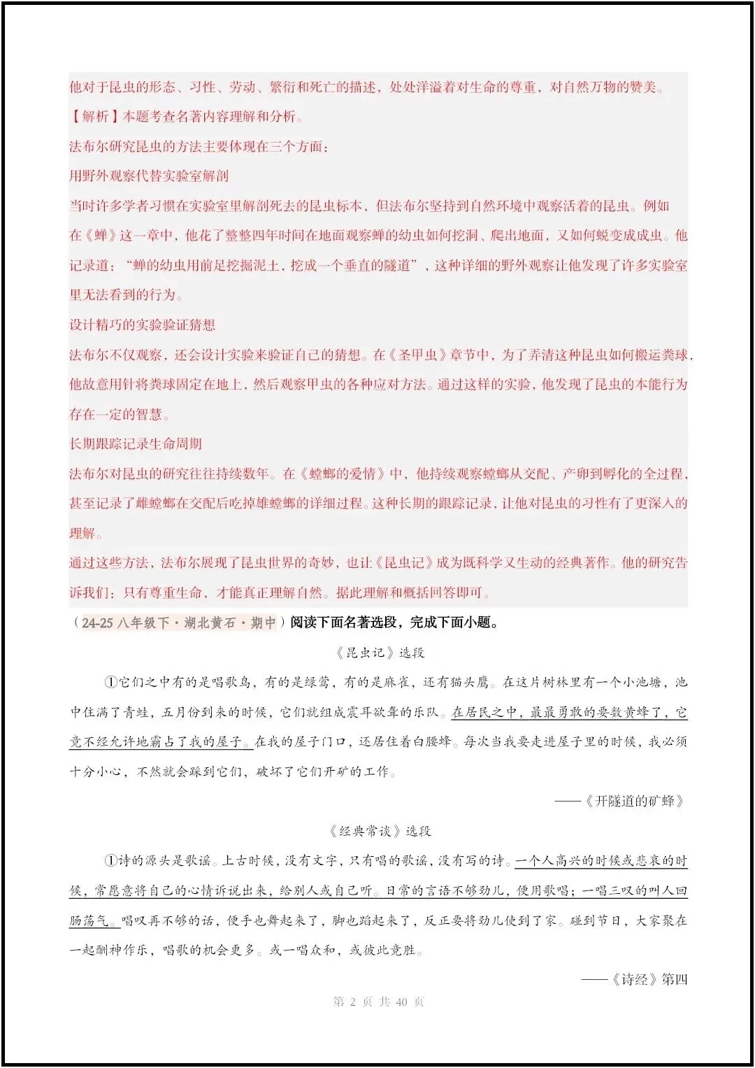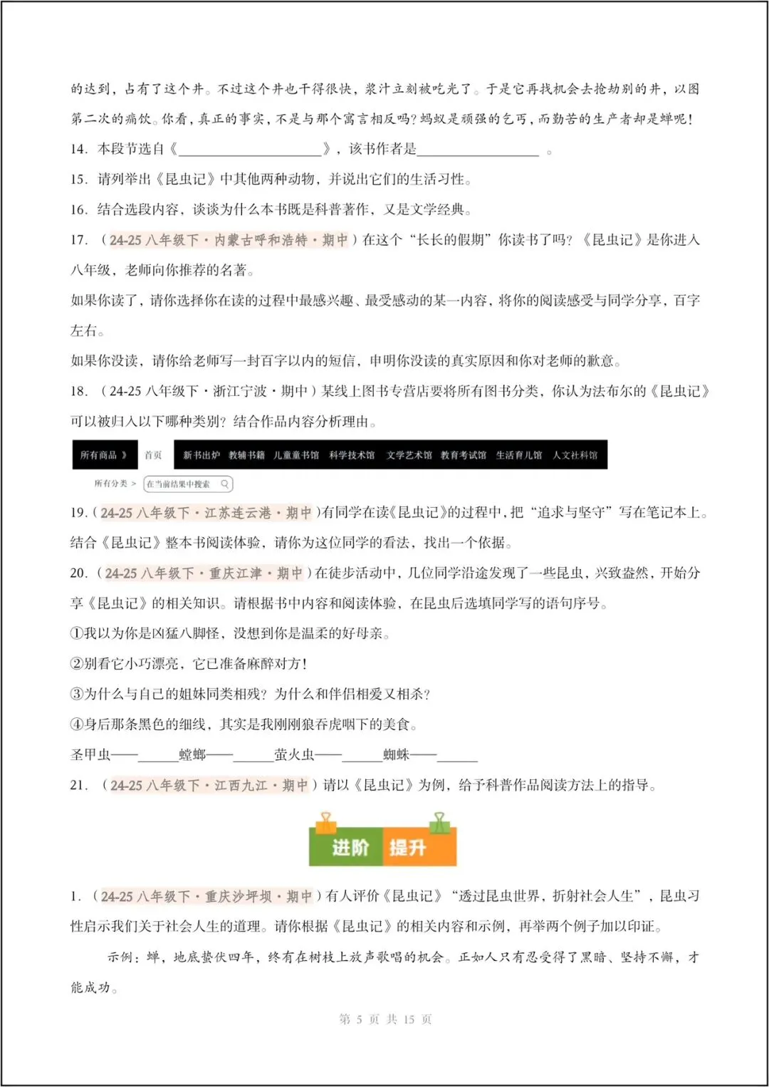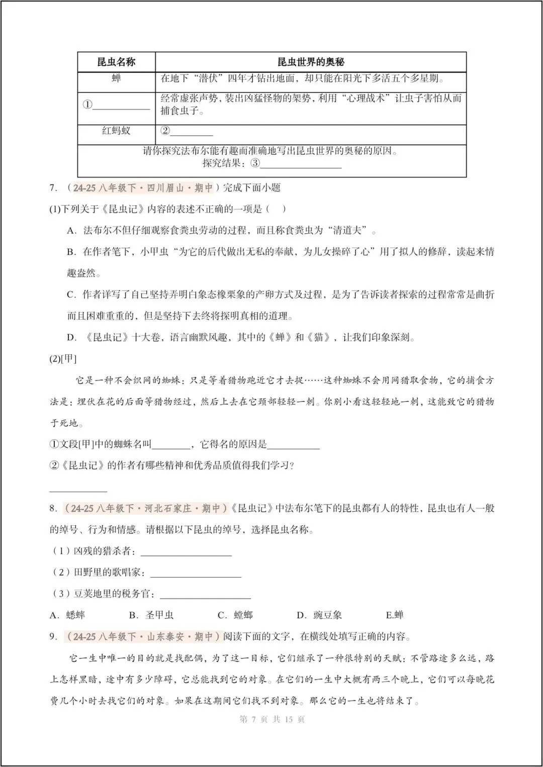 期中复习资料|2026新人教版八年级下册语文 名著《昆虫记》(期中真题汇编)(考点梳理,熟记)附答案解析电子版可打印!