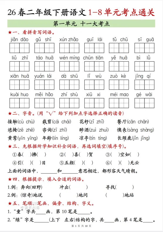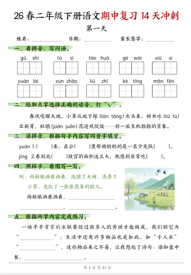 【期中资料】|26春二年级下册语文期中复习14天冲刺完整版(文末免费下载)