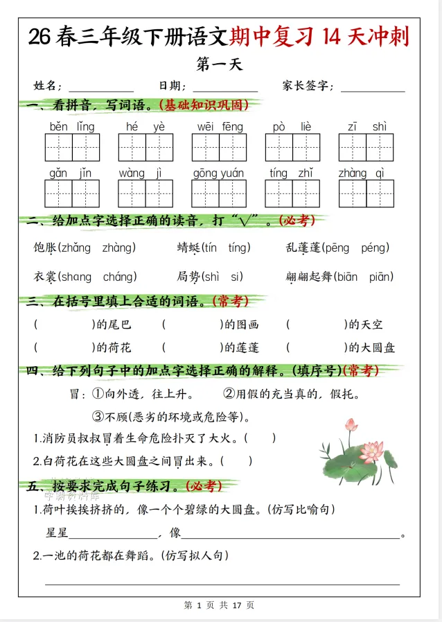 【期中资料】|26春一年级下册语文期中复习14天冲刺完整版(文末免费下载)