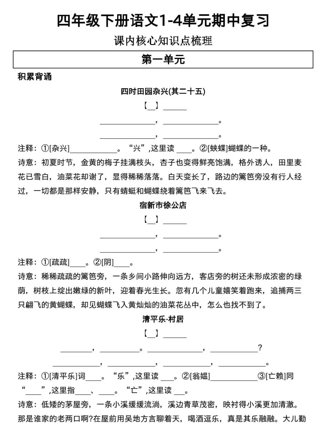 >【免费资料】2026.4.14分享-四年级下册语文1-4单元期中复习