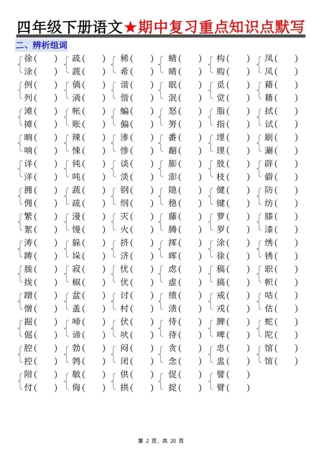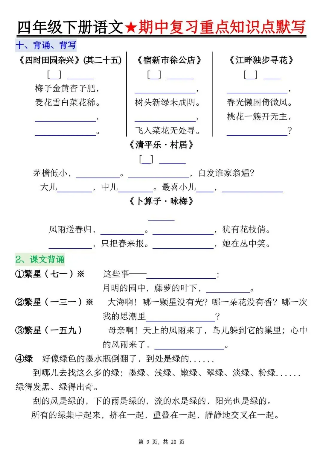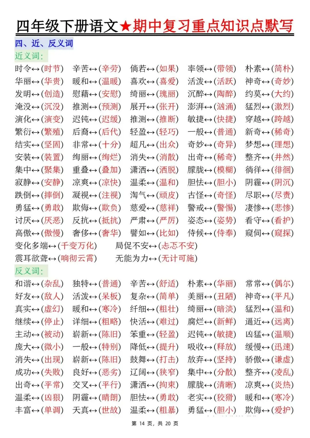 今日分享2四年级下册语文《期中复习重点知识点默写》(含答案20页),需要的家长抓紧打印出来,让孩子在每天练一练吧。