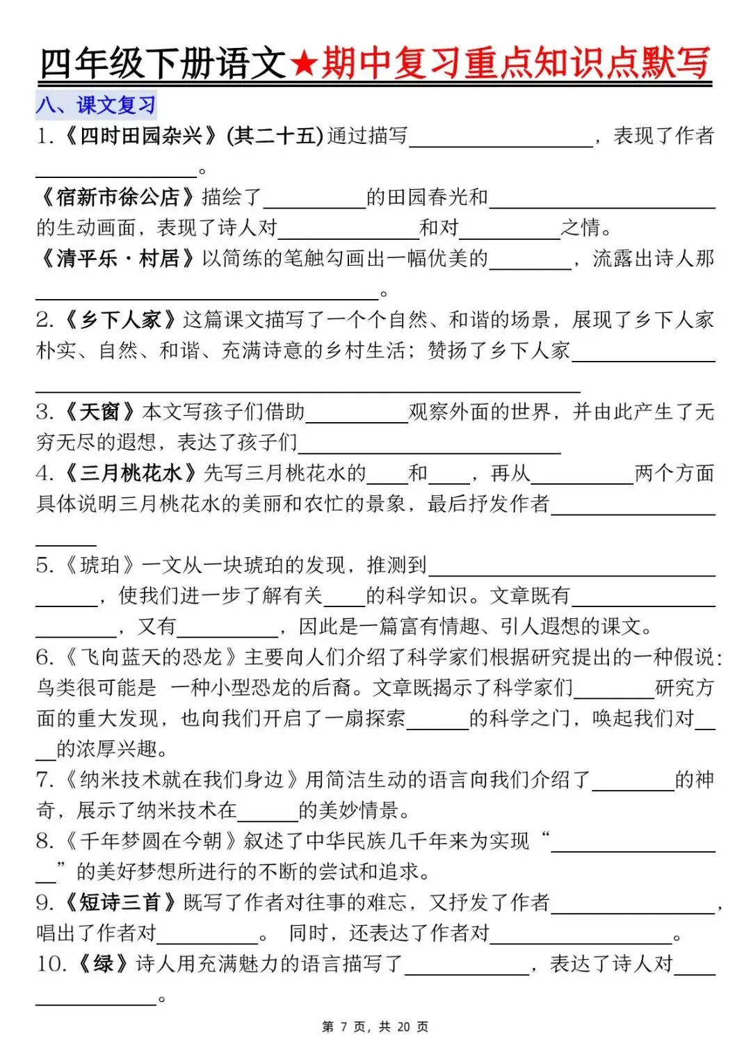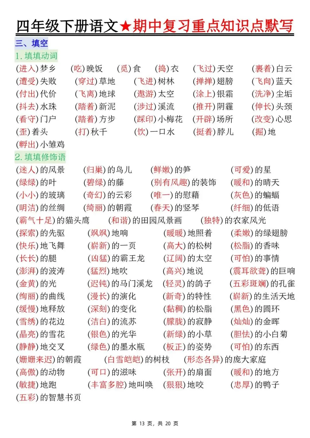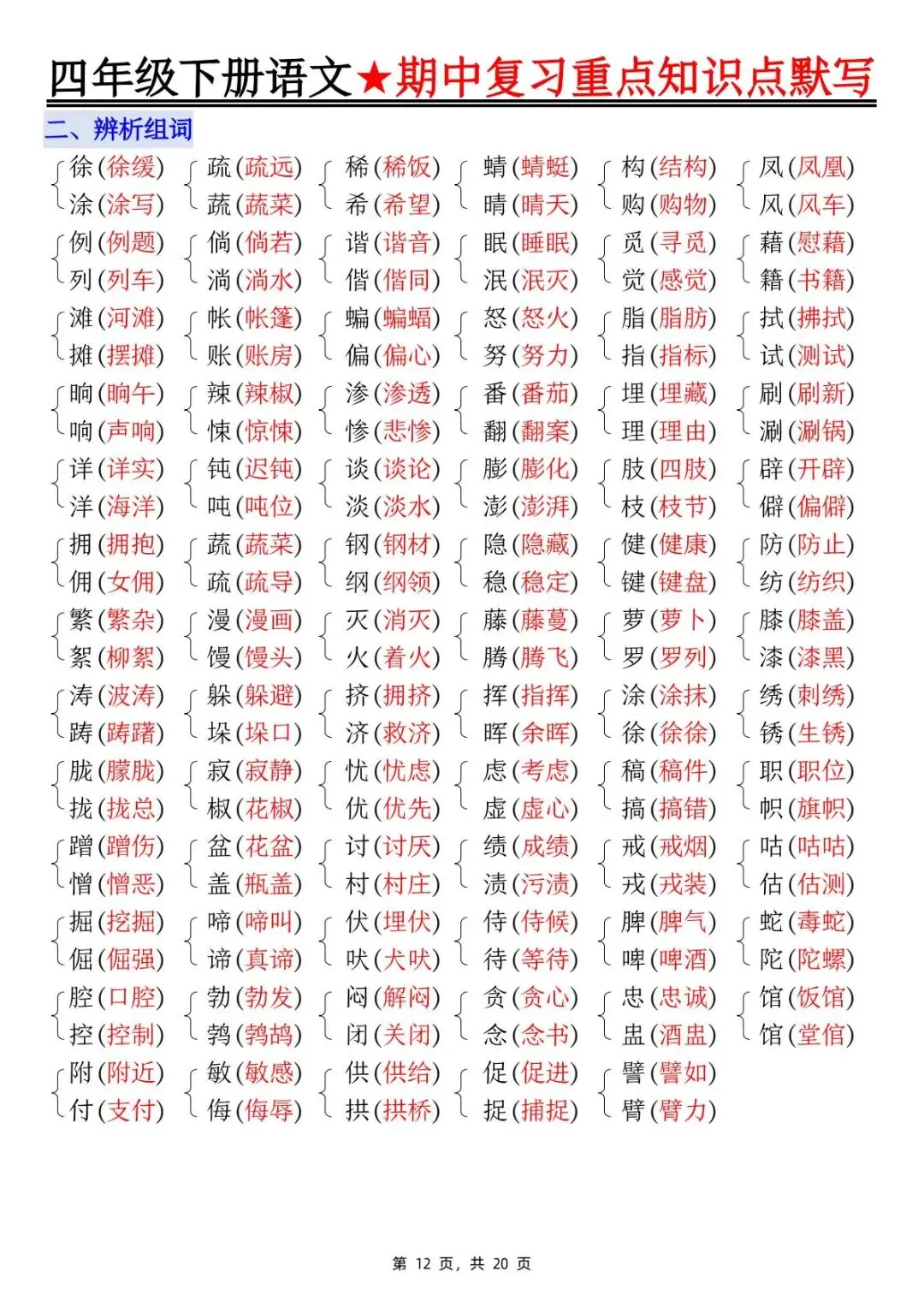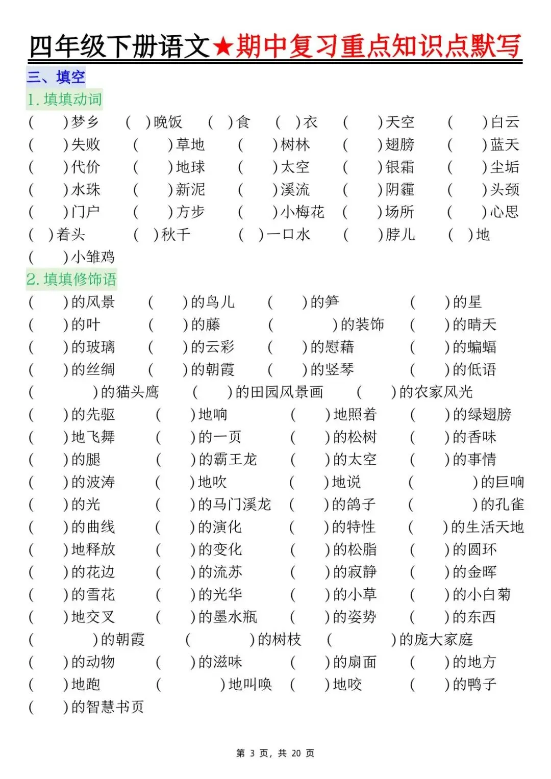 今日分享2四年级下册语文《期中复习重点知识点默写》(含答案20页),需要的家长抓紧打印出来,让孩子在每天练一练吧。