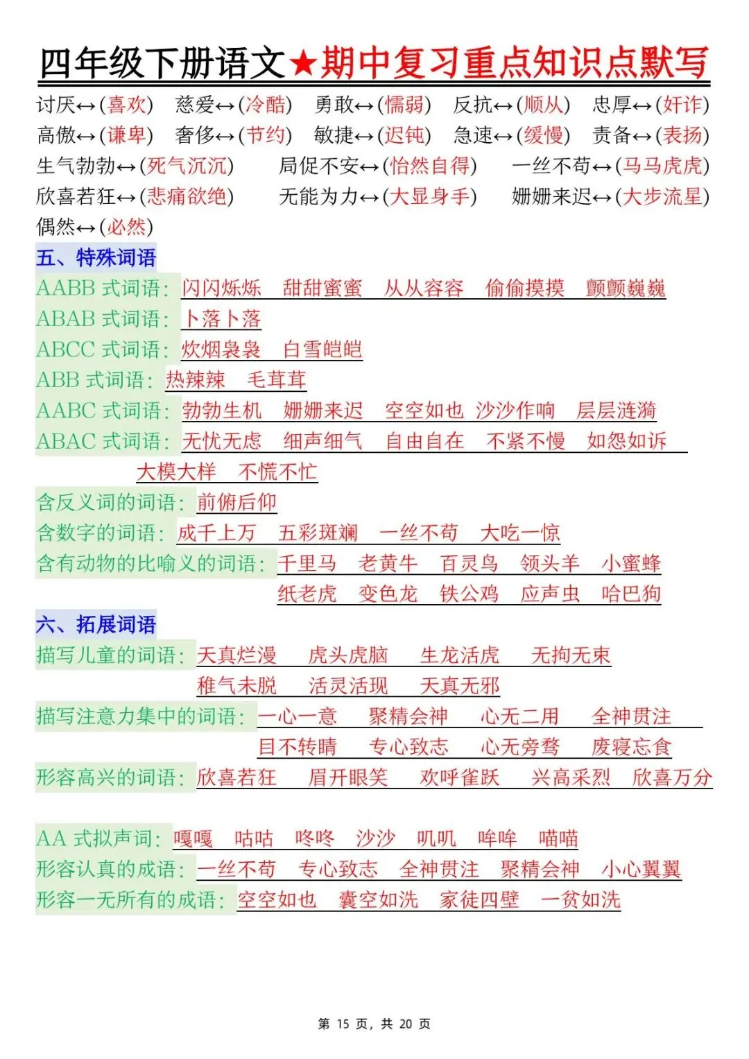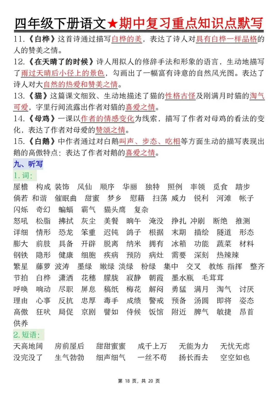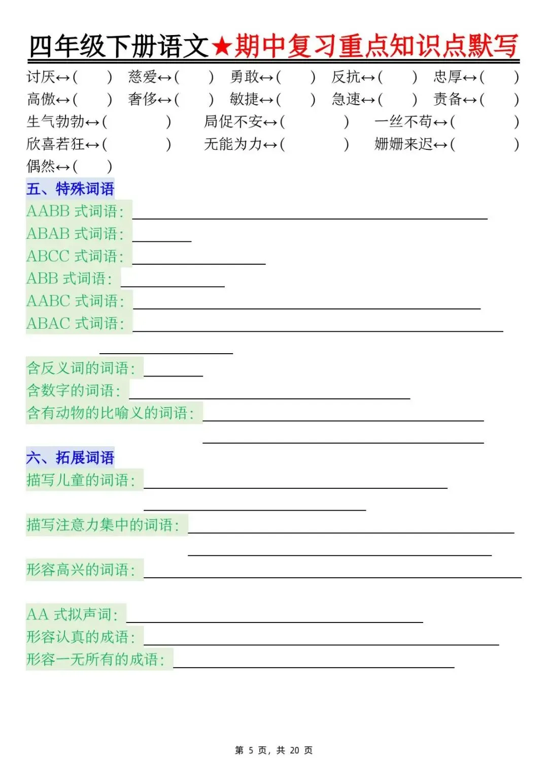 【小学资料】四年级下册语文《期中复习重点知识点默写》(含答案20页)四年级下册语文《期中归类》电子版可打印