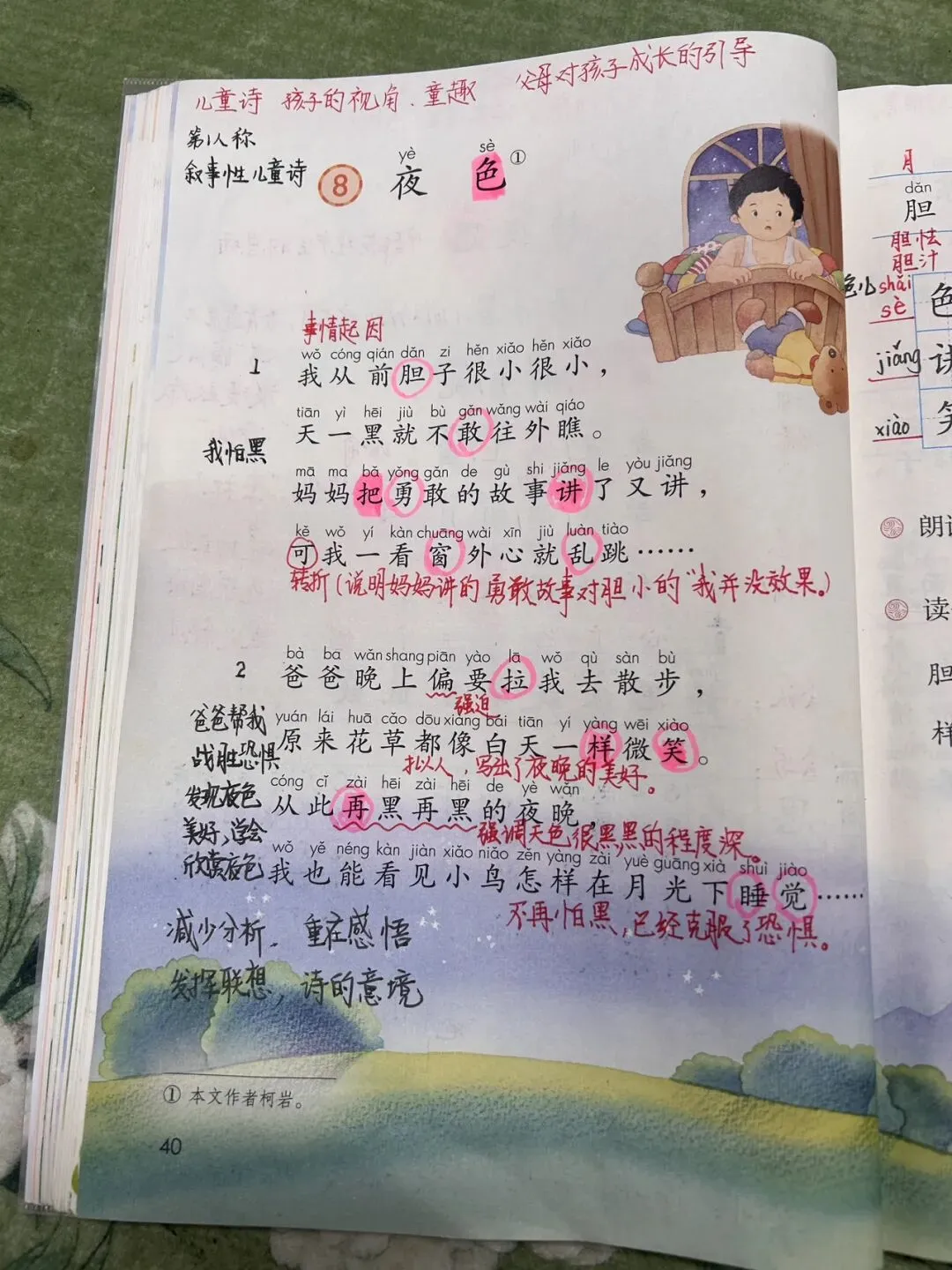 《夜色》这篇课文是一首充满童趣的儿歌。写“我”从前胆子很小,怕黑,后来和爸爸出去散步后发现夜晚也像白天一样美好,“我”不再怕黑。教育我们要做一个勇敢的孩子。《夜色》捕捉到孩子们怕黑的心理,以打动儿童心扉的文字,呼唤着孩子们亲近自然、热爱生活。从文中可感觉童年的纯真,可爱,体会成长的快乐。