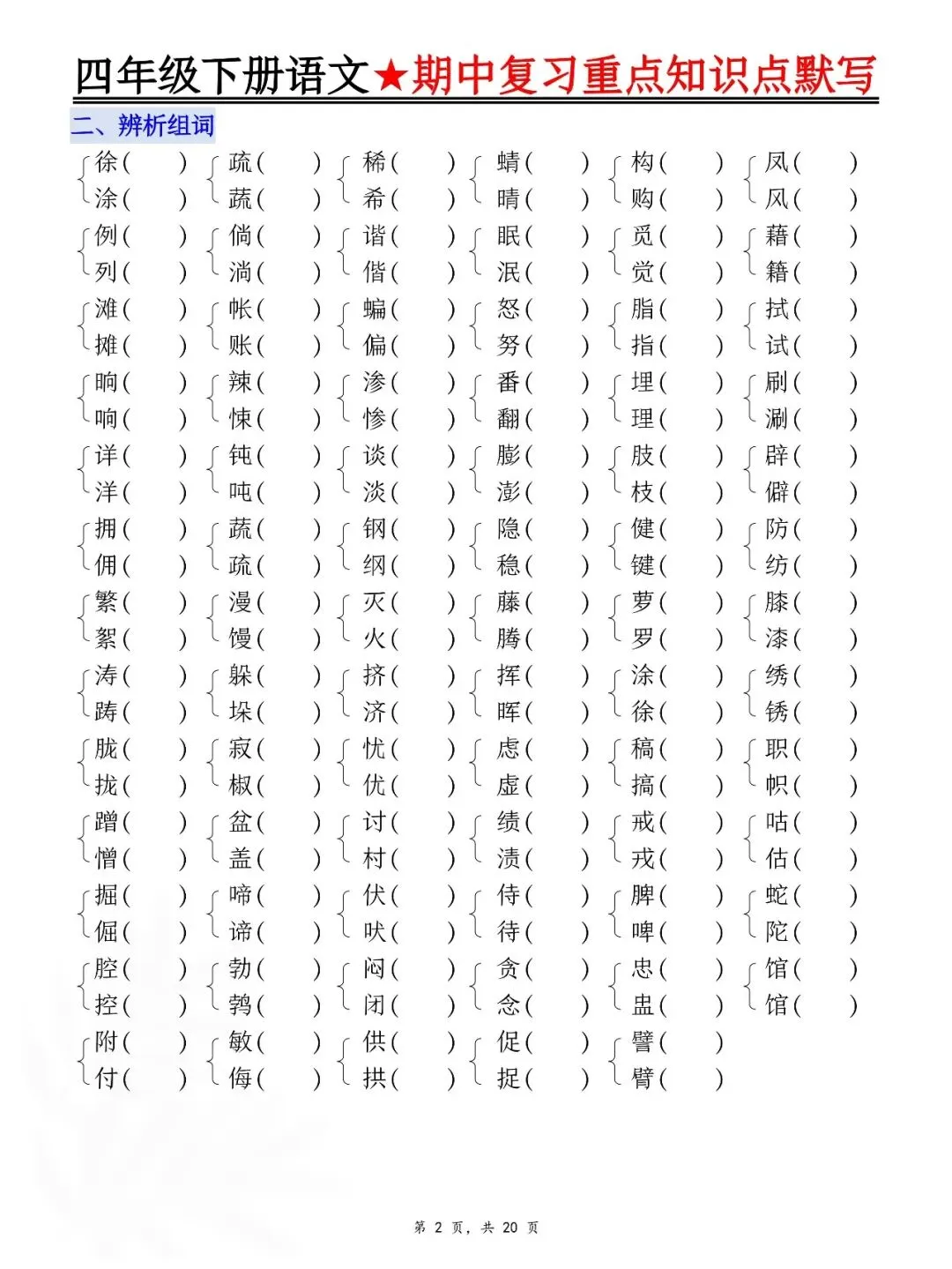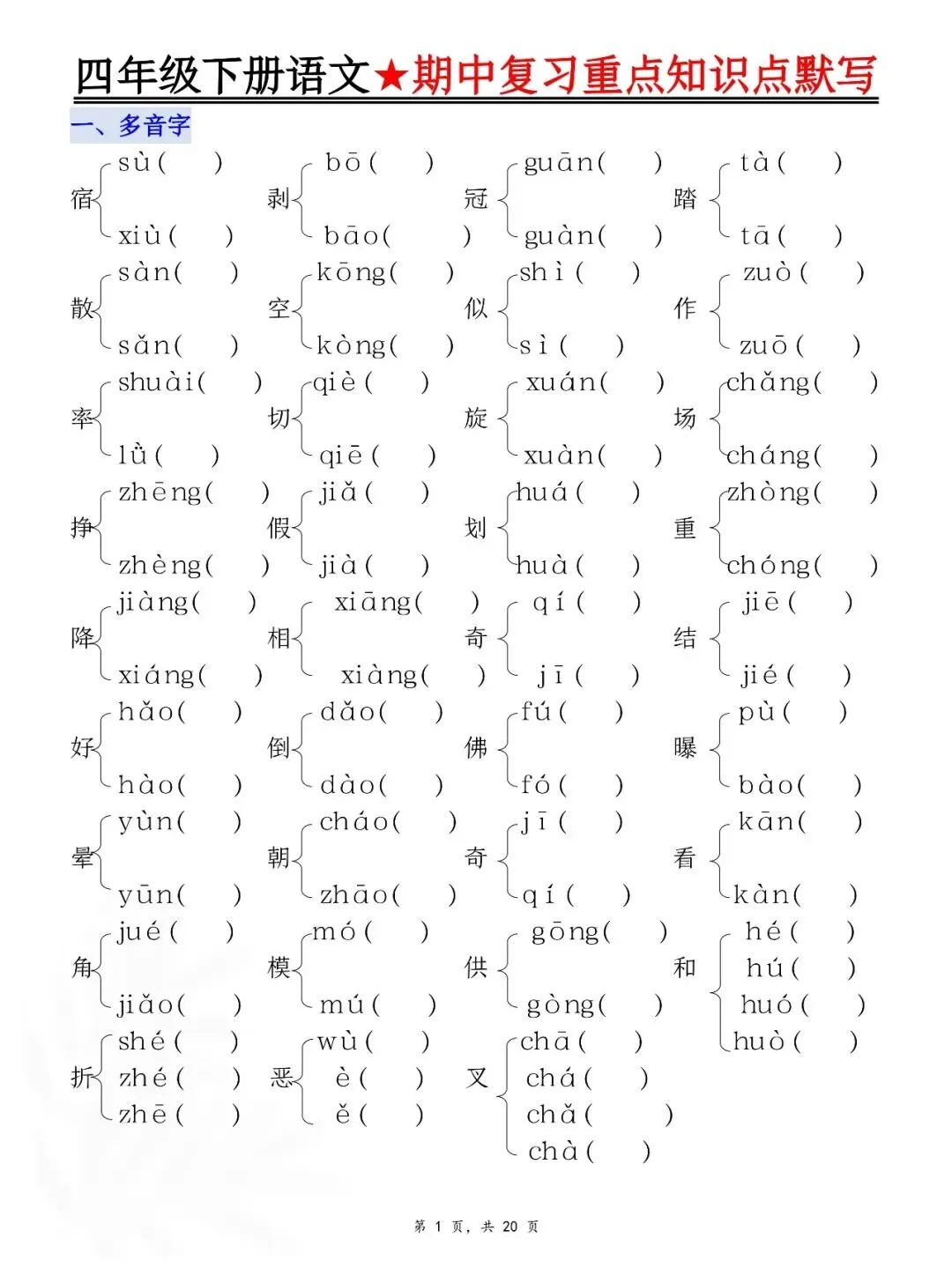 新版四下语文期中复习重点知识点默写(含答案20页),电子版可下载可打印,这份资料包含了多音字、辨析组词、动词与修饰语填空、近反义词、特殊词语、仿写造句、课文复习要点以及必背古诗文等内容,帮助孩子系统梳理四年级下册语文期中考试的重点知识。需要的家长抓紧打印出来,让孩子练一练吧。💯