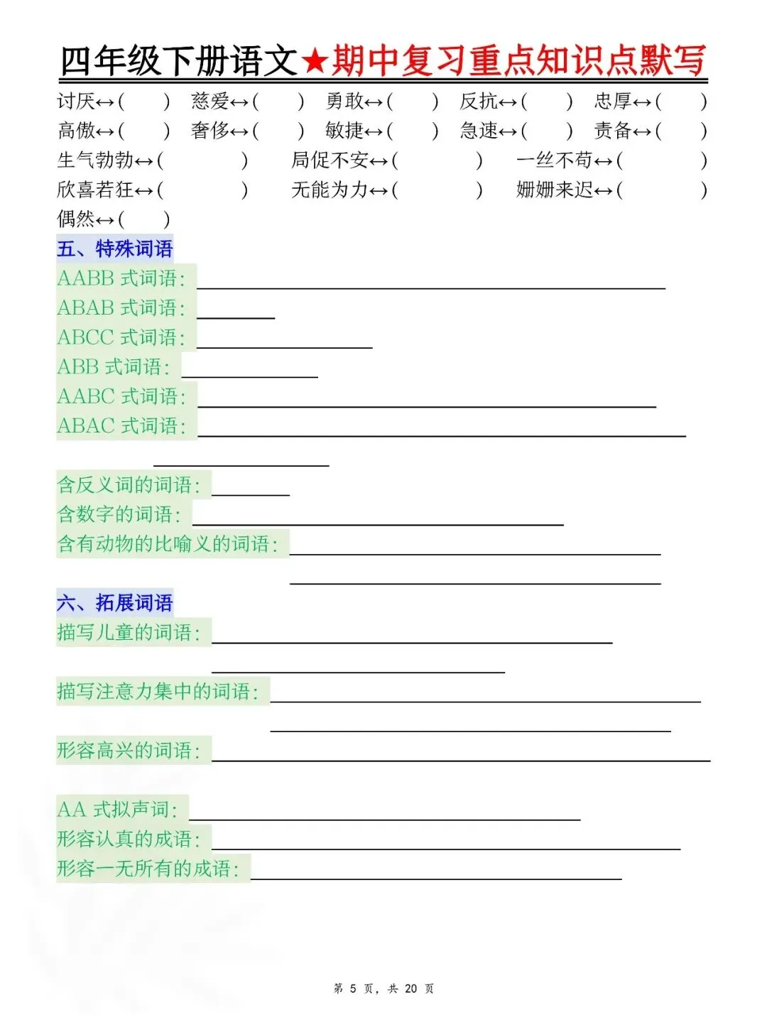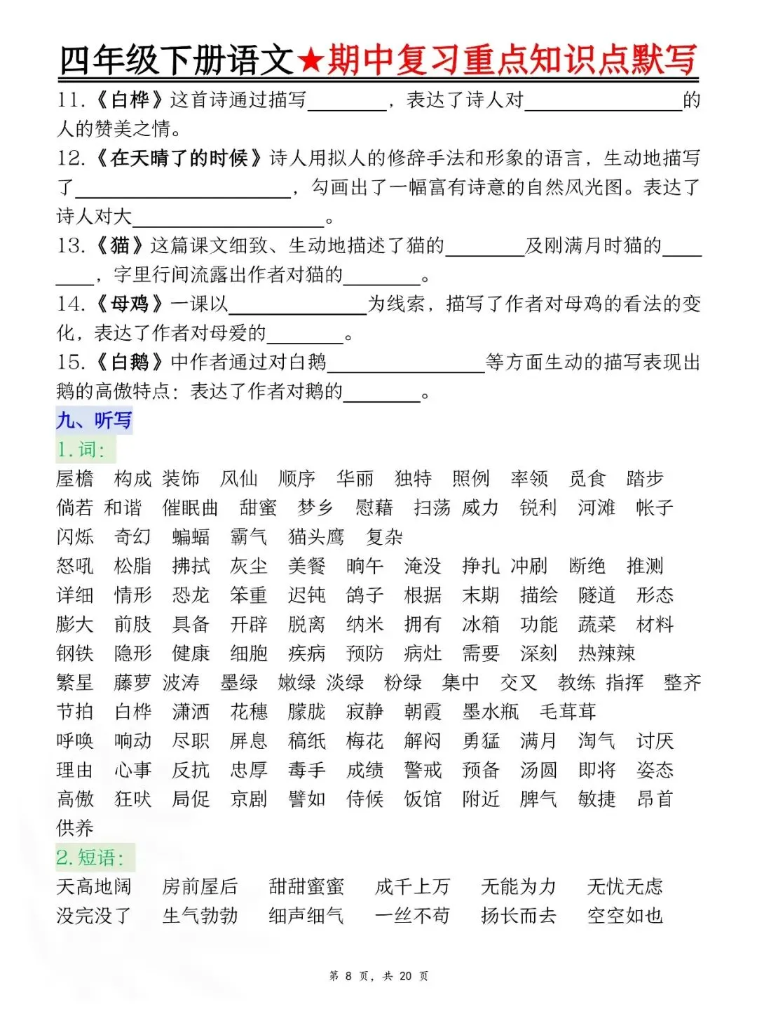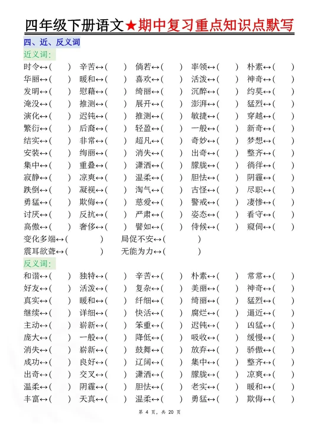 新版四下语文《期中复习重点知识点默写》含共20页,电子版可打印
