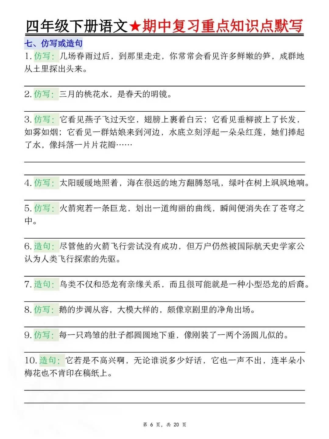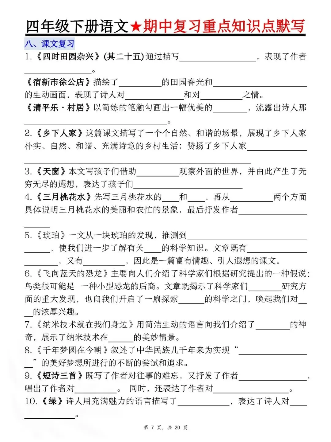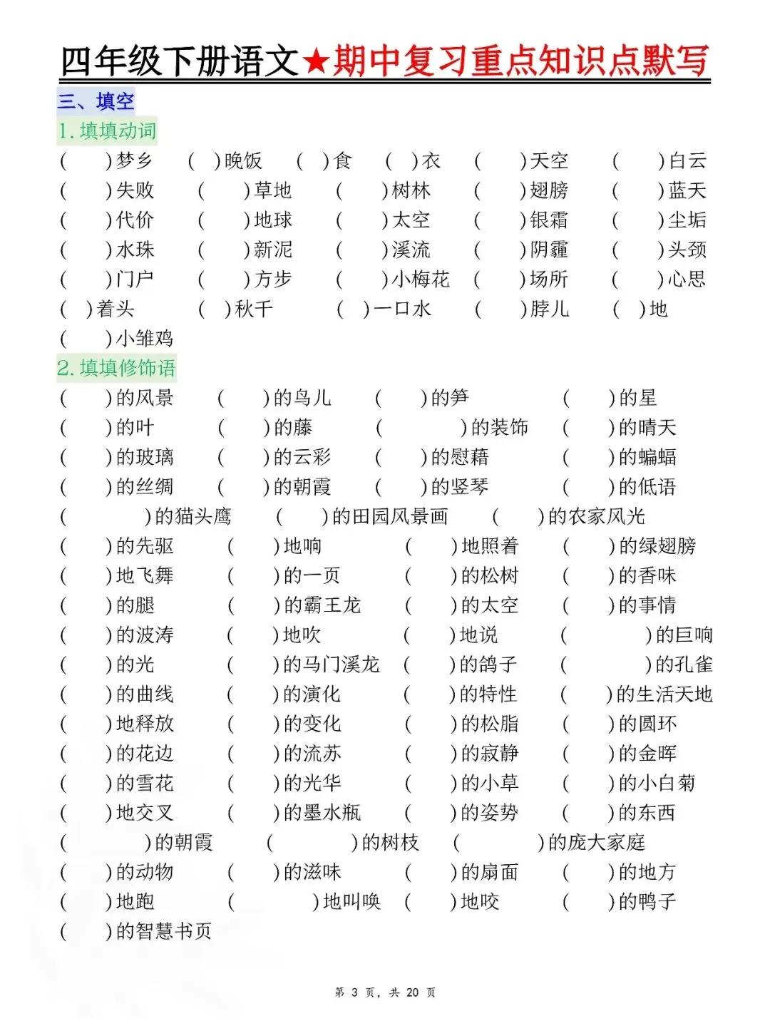 新版四下语文《期中复习重点知识点默写》含共20页,电子版可打印
