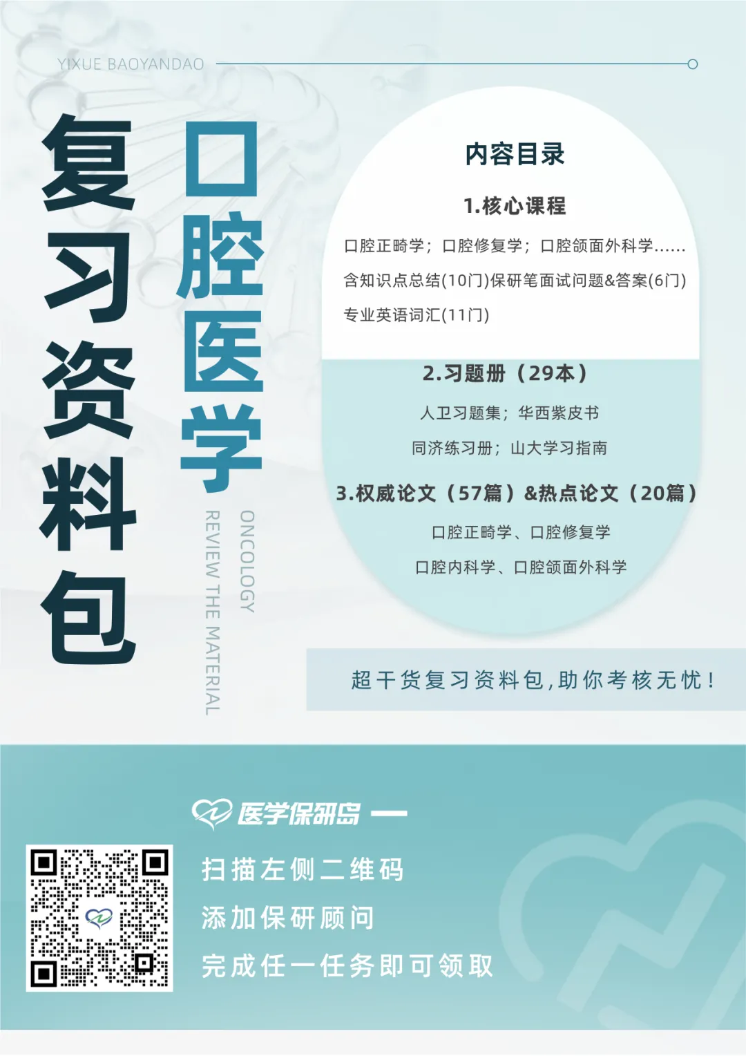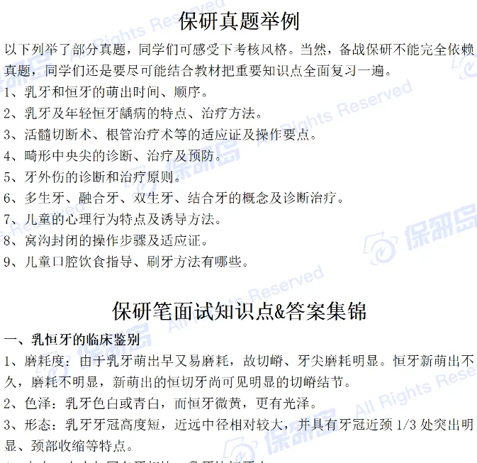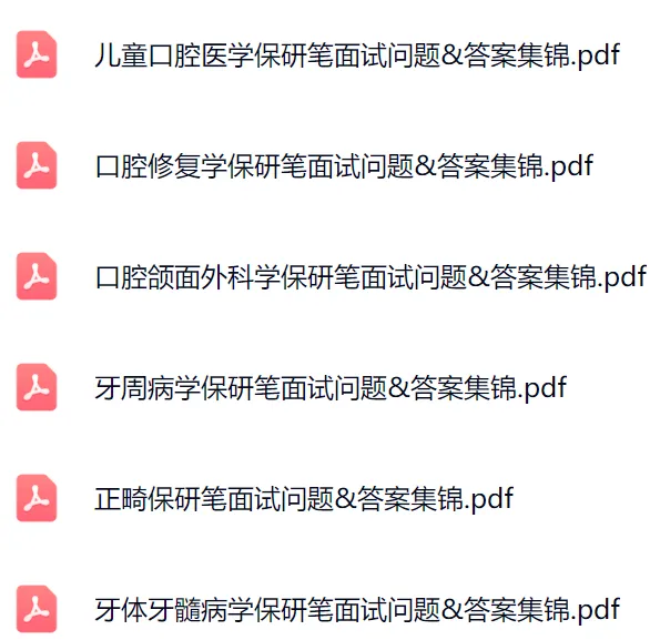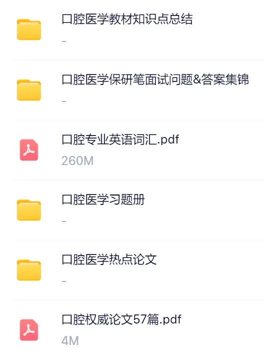 本资料囊括了口腔医学核心课程的教材知识点总结、保研笔面试问题&答案集锦、专业英语词汇、习题册、权威论文、热点论文,照顾到口腔医学保研er复习过程的方方面面。