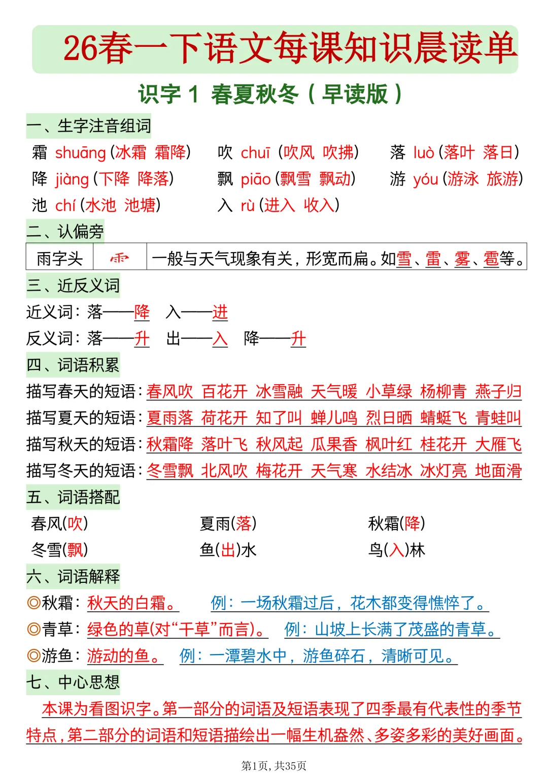 #一年级语文#一下语文#期中复习#晨读小单#每课知识点#核心考点#课文必背#期中备考#小学语文基础#晨读打卡