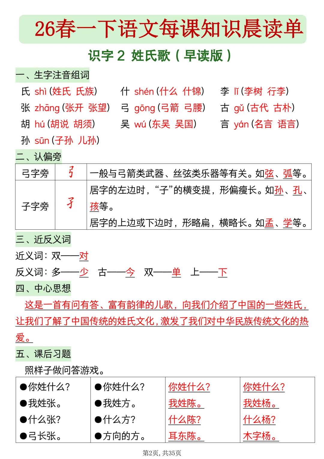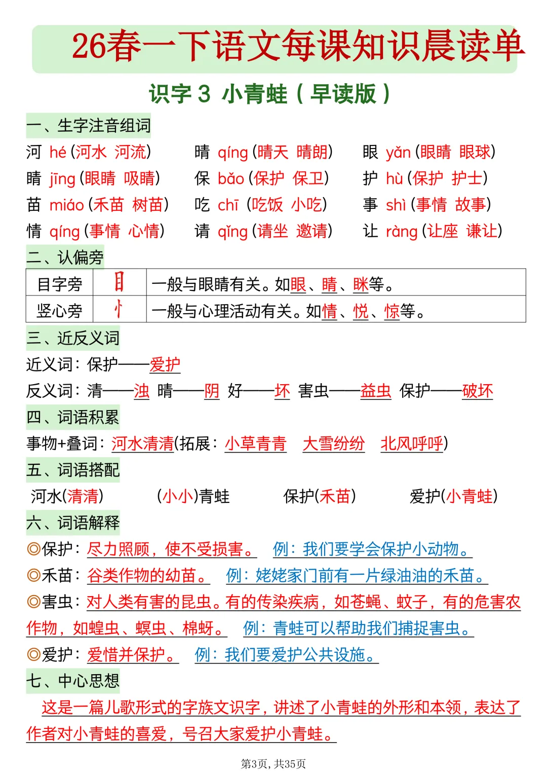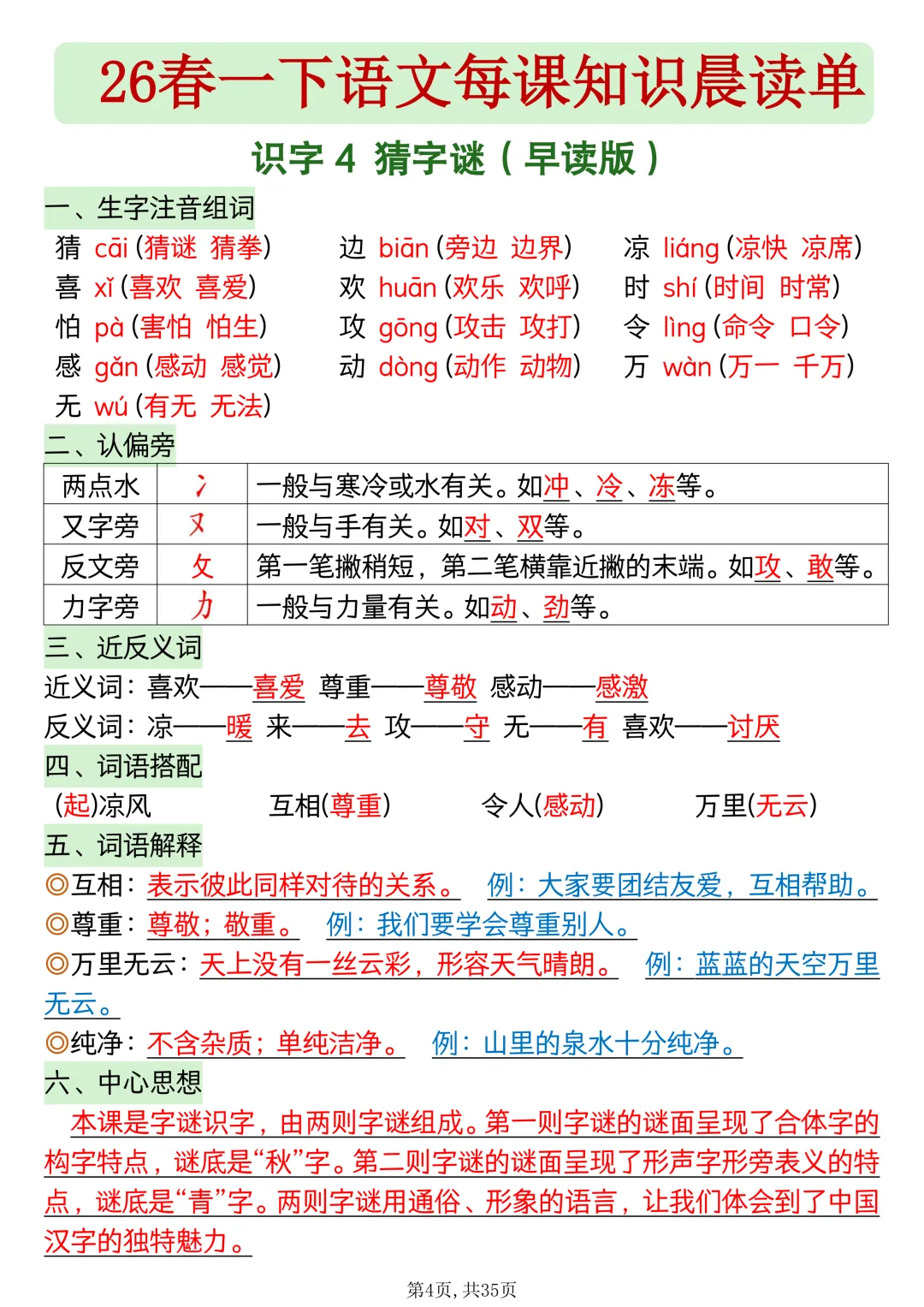 26 春一年级语文下册《期中复习每课核心知识点晨读小单》来啦✨按1–4 单元每课整理,包含必会生字、易错笔顺、重点词语、课文中心、必背句子、日积月累。内容精简、重点突出,一页一课,晨读 5 分钟搞定,考前快速过一遍,基础扎实不丢分💯