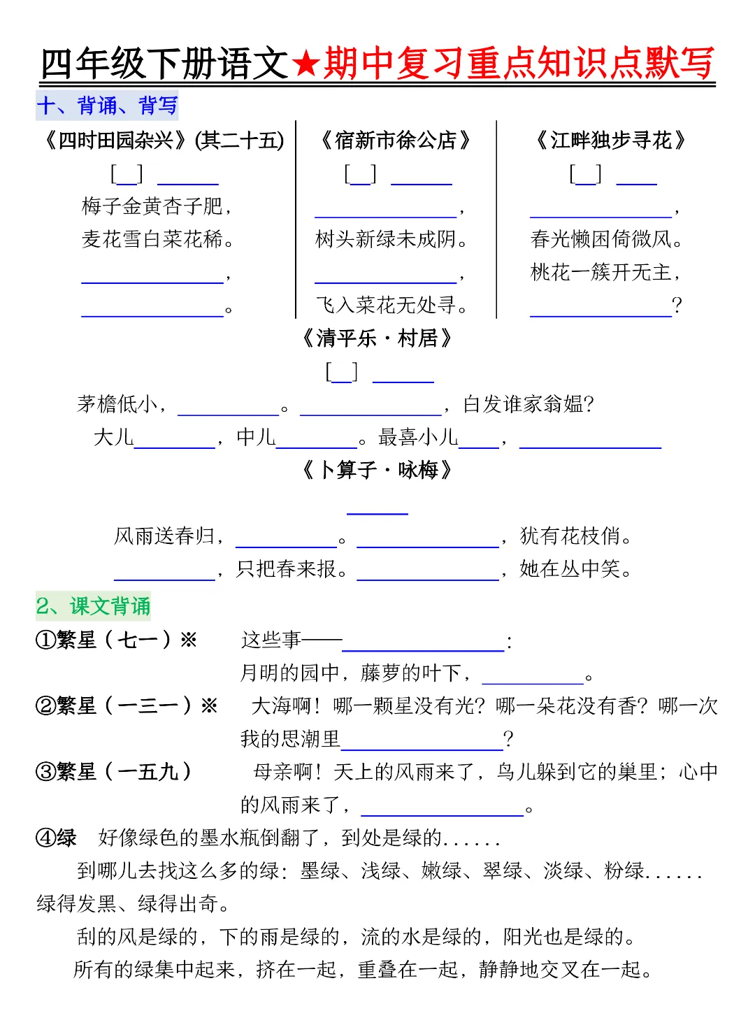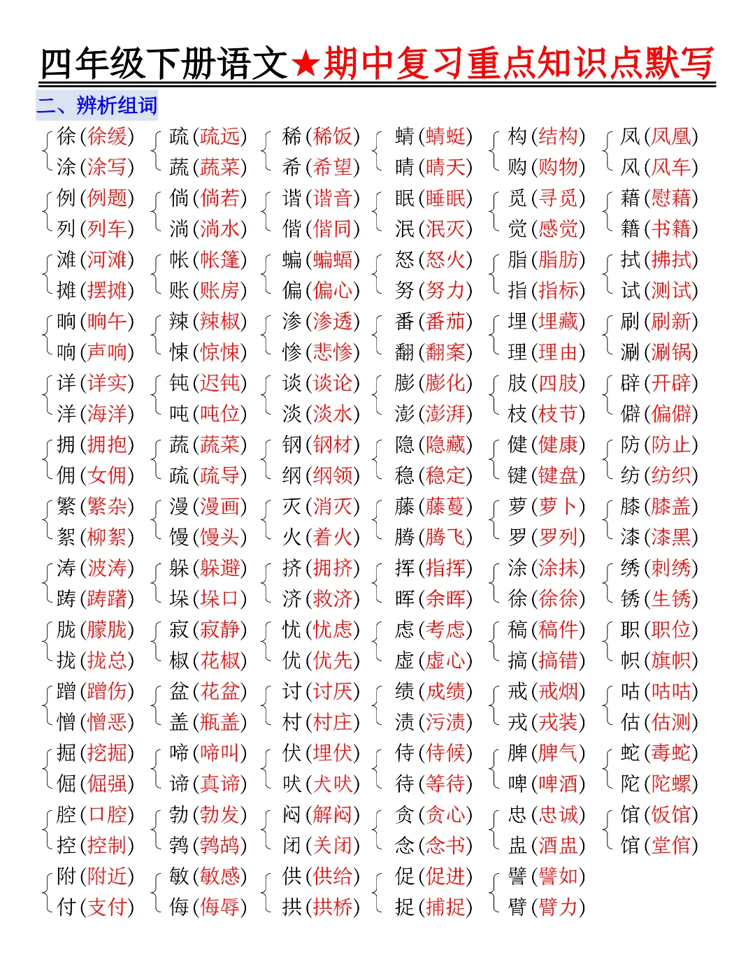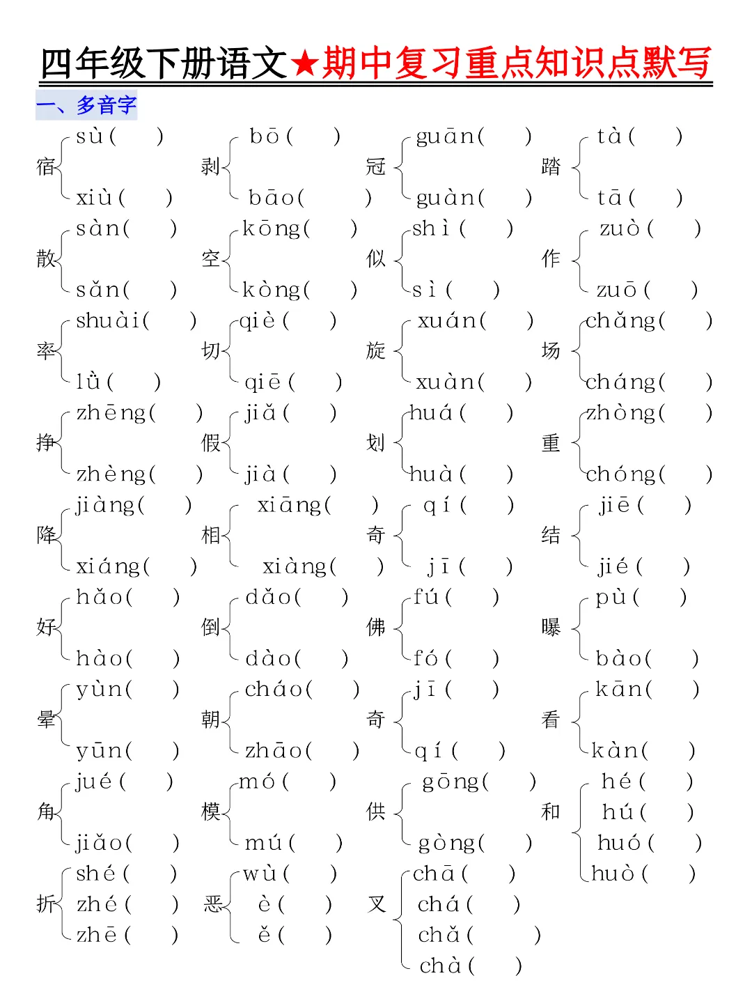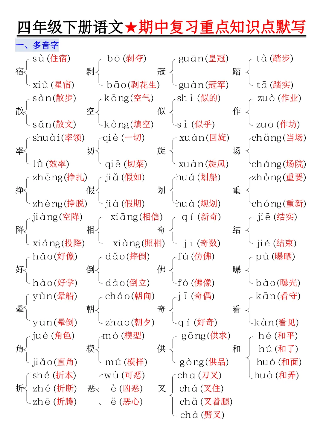 2026 年人教版四年级下册语文期中复习重点知识点汇总 + 默写专项,全套共 20 页,电子版可直接下载打印。这份四下语文期中考点总结与默写练习,涵盖多音字、形近字辨析组词、近反义词、句子仿写与造句、课文背诵默写等高频考点,帮助孩子扎实巩固知识、夯实语文基础。有需要的家长抓紧打印,让孩子认真练习起来吧!