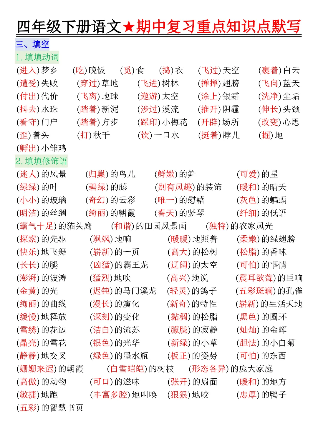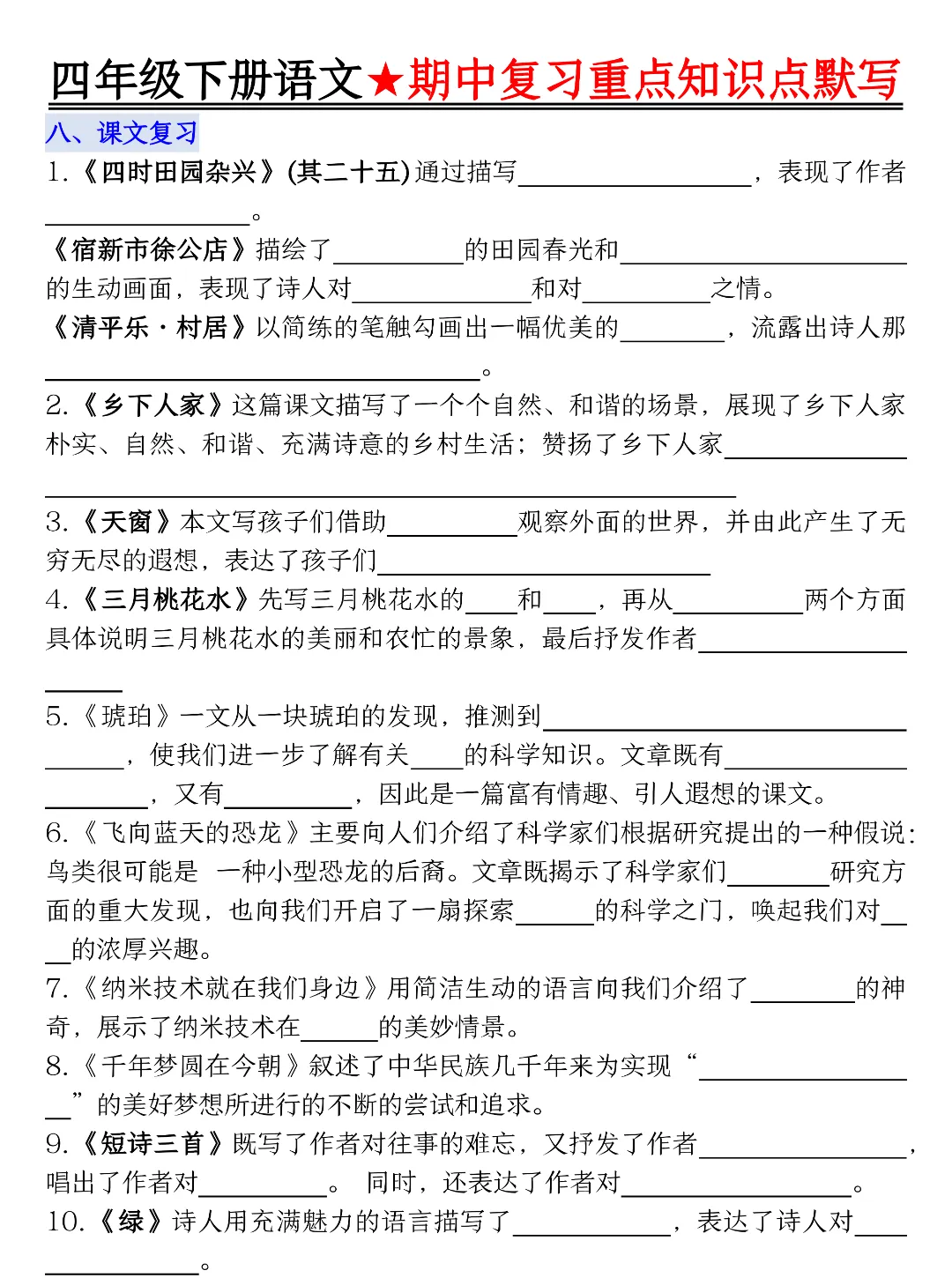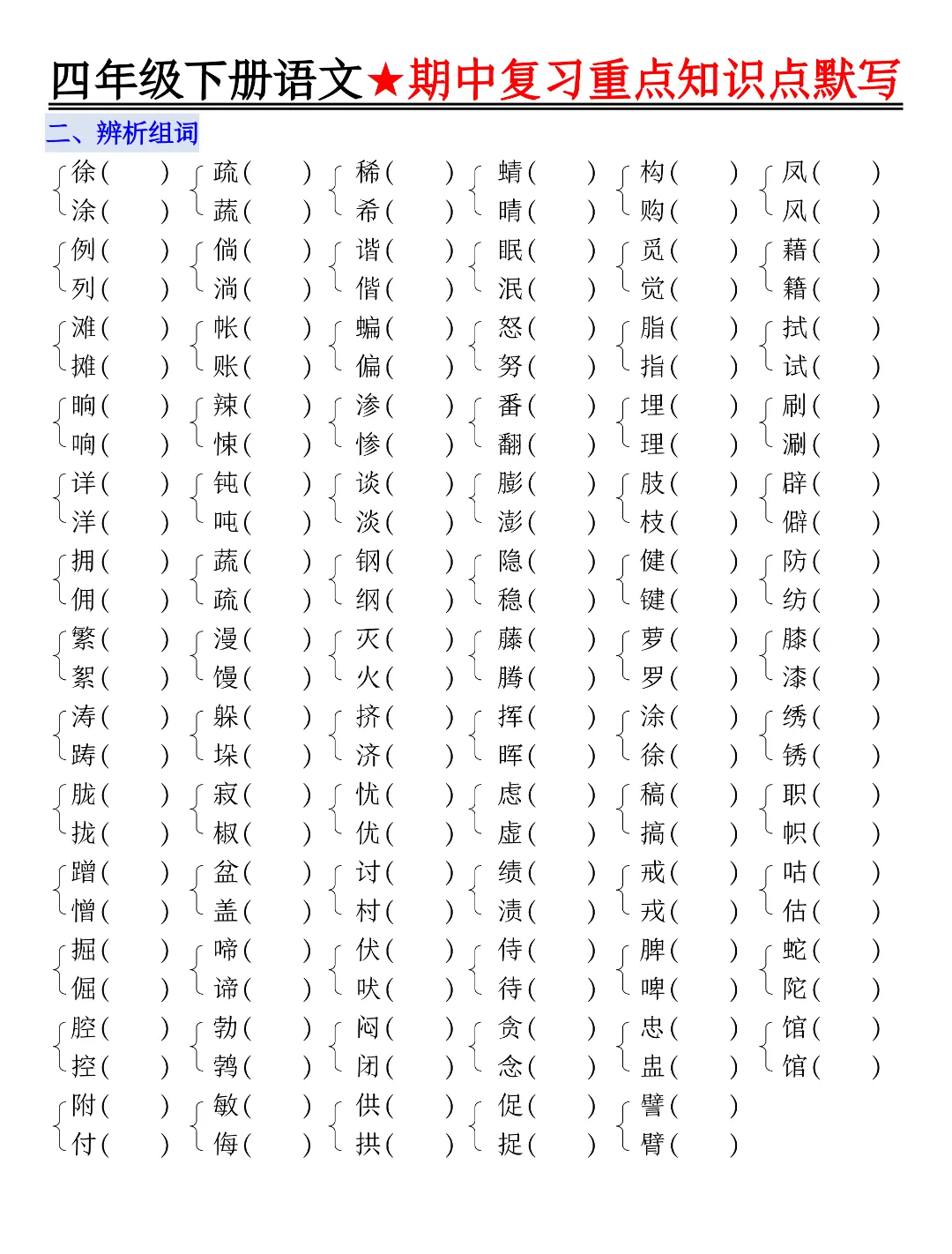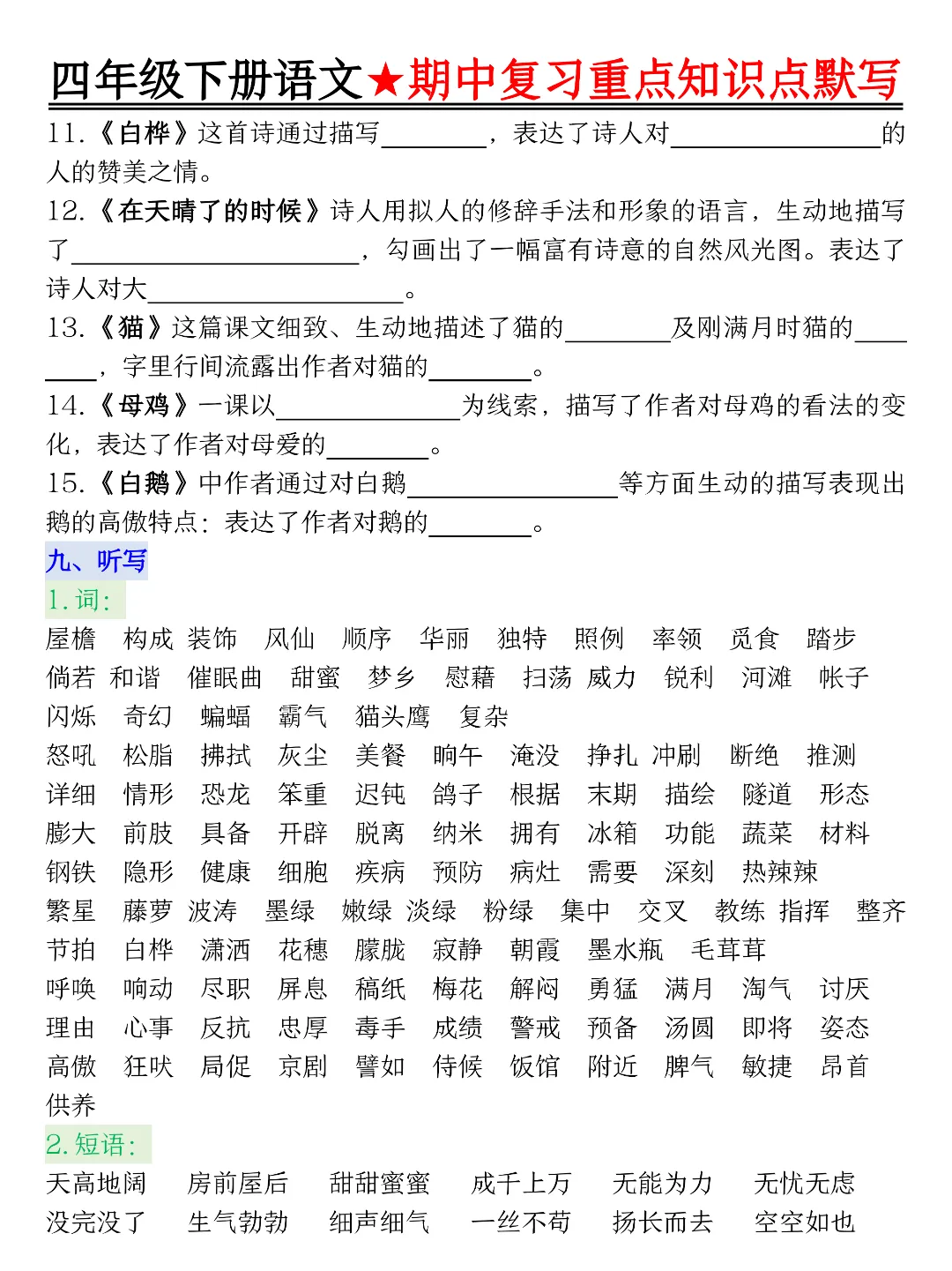 2026 年人教版四年级下册语文期中复习重点知识点汇总 + 默写专项,全套共 20 页,电子版可直接下载打印。这份四下语文期中考点总结与默写练习,涵盖多音字、形近字辨析组词、近反义词、句子仿写与造句、课文背诵默写等高频考点,帮助孩子扎实巩固知识、夯实语文基础。有需要的家长抓紧打印,让孩子认真练习起来吧!