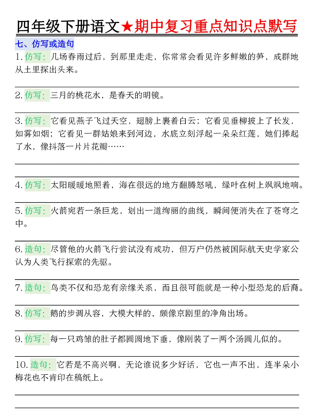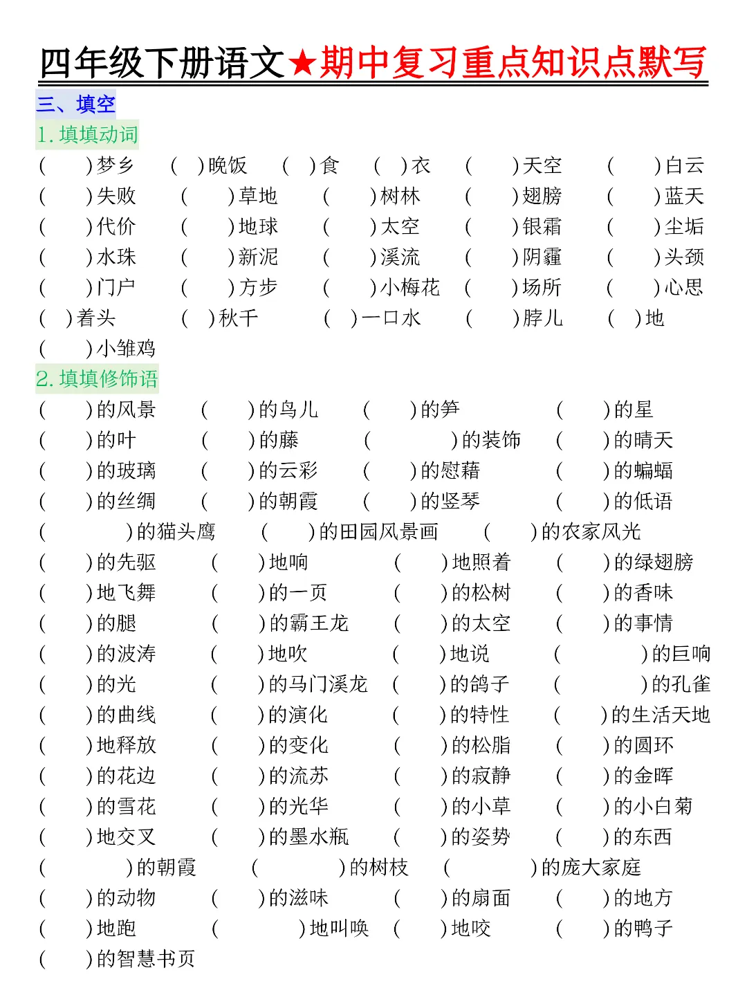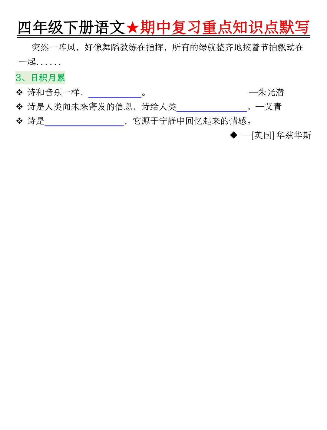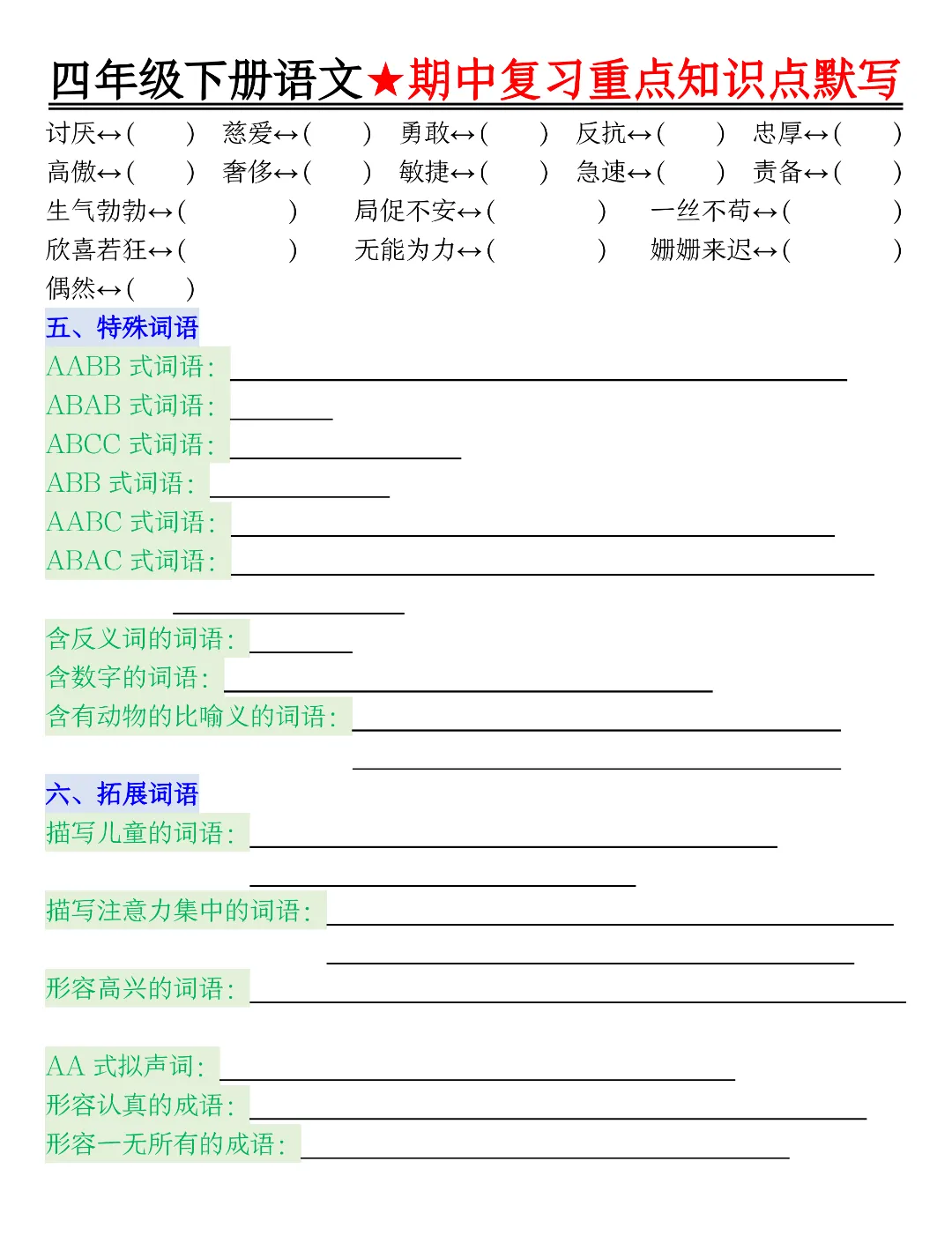 2026 年人教版四年级下册语文期中复习重点知识点汇总 + 默写专项,全套共 20 页,电子版可直接下载打印。这份四下语文期中考点总结与默写练习,涵盖多音字、形近字辨析组词、近反义词、句子仿写与造句、课文背诵默写等高频考点,帮助孩子扎实巩固知识、夯实语文基础。有需要的家长抓紧打印,让孩子认真练习起来吧!