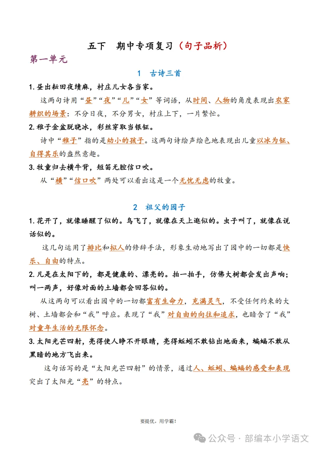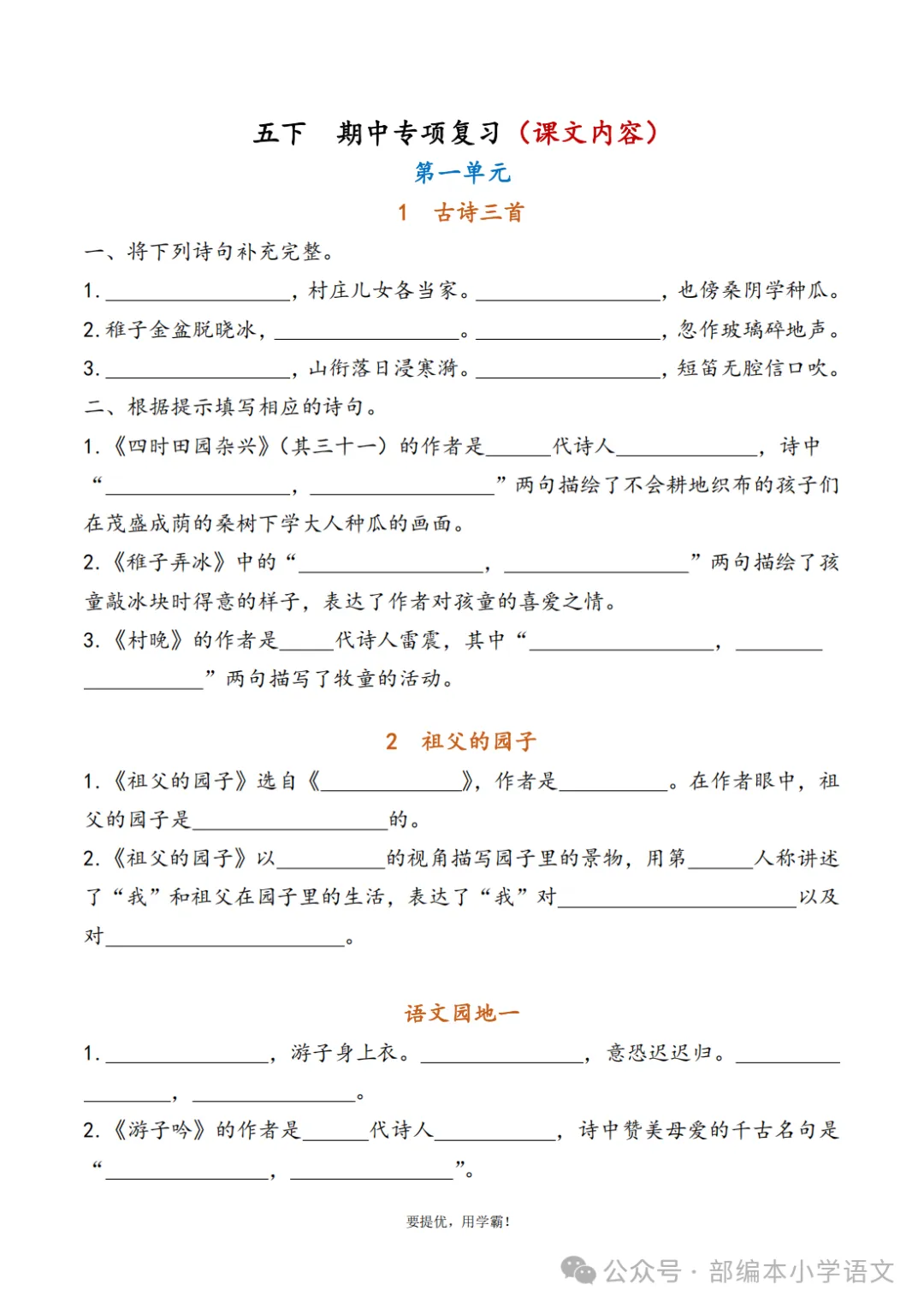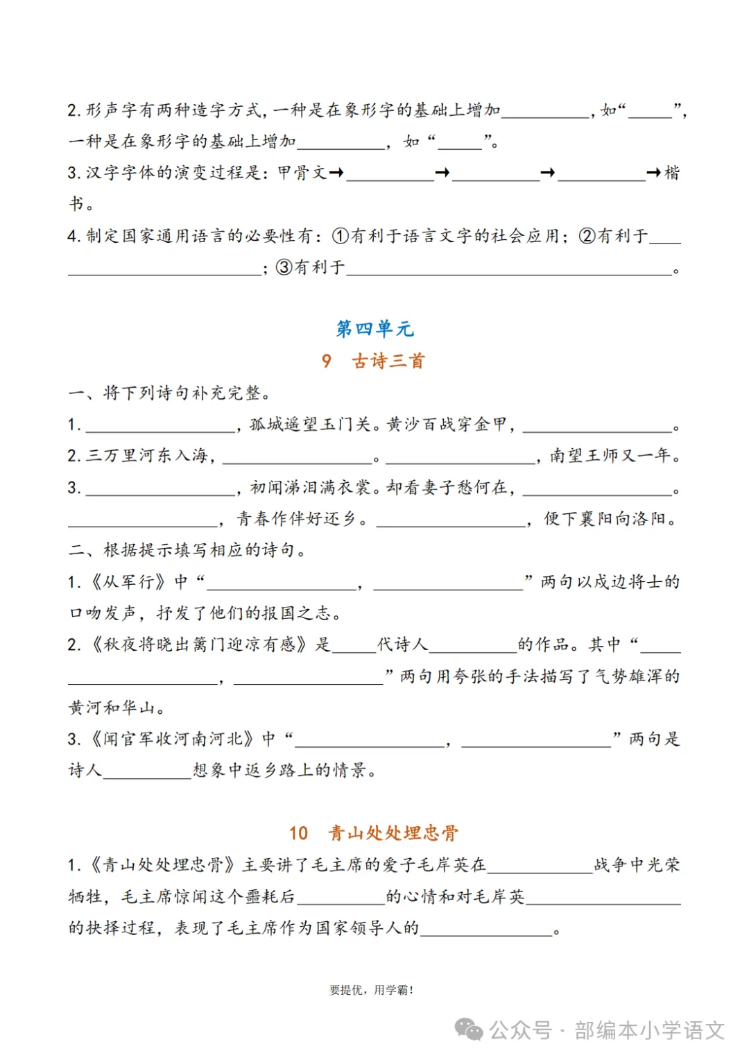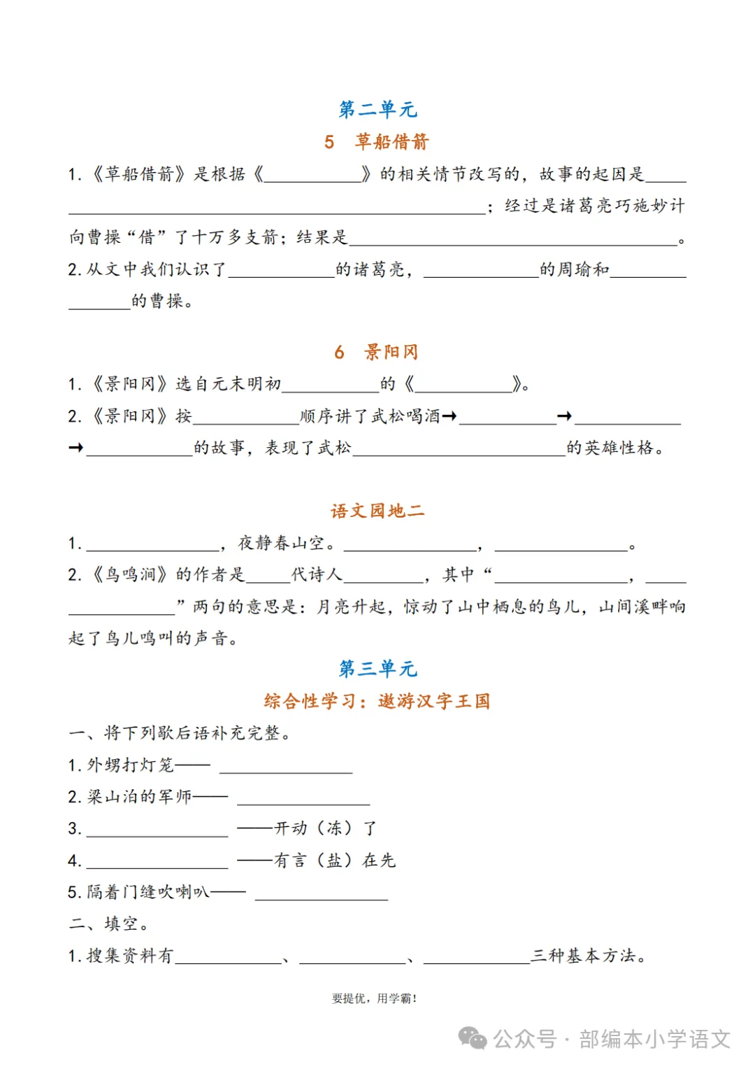 声明:本公众号尊重原创,素材来源网络,好的内容值得分享,如有侵权请联系删除。更多资料请点击“中小学各学科上下册空中课堂、微课汇总”。下载完整版方式▲扫码关注编部本小学语文 在公众号消息框(后台)回复:综合复习资料下载视频讲解(点击观看)