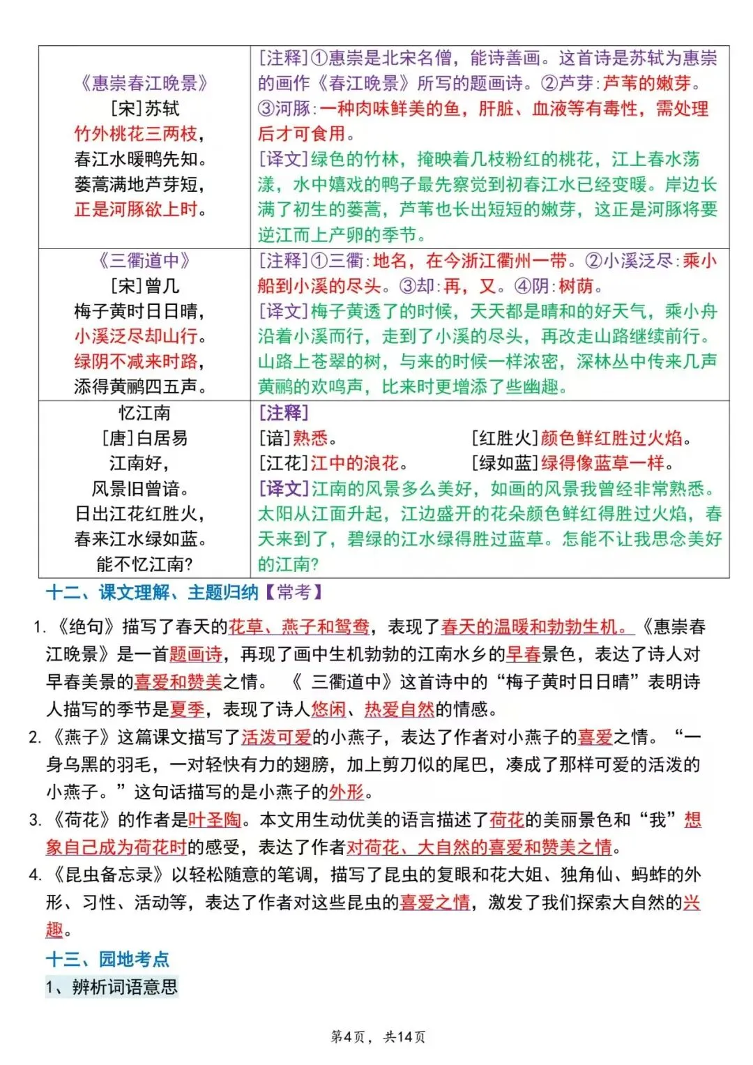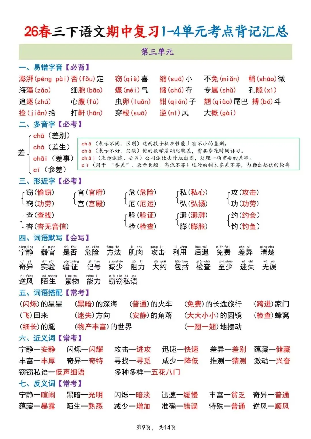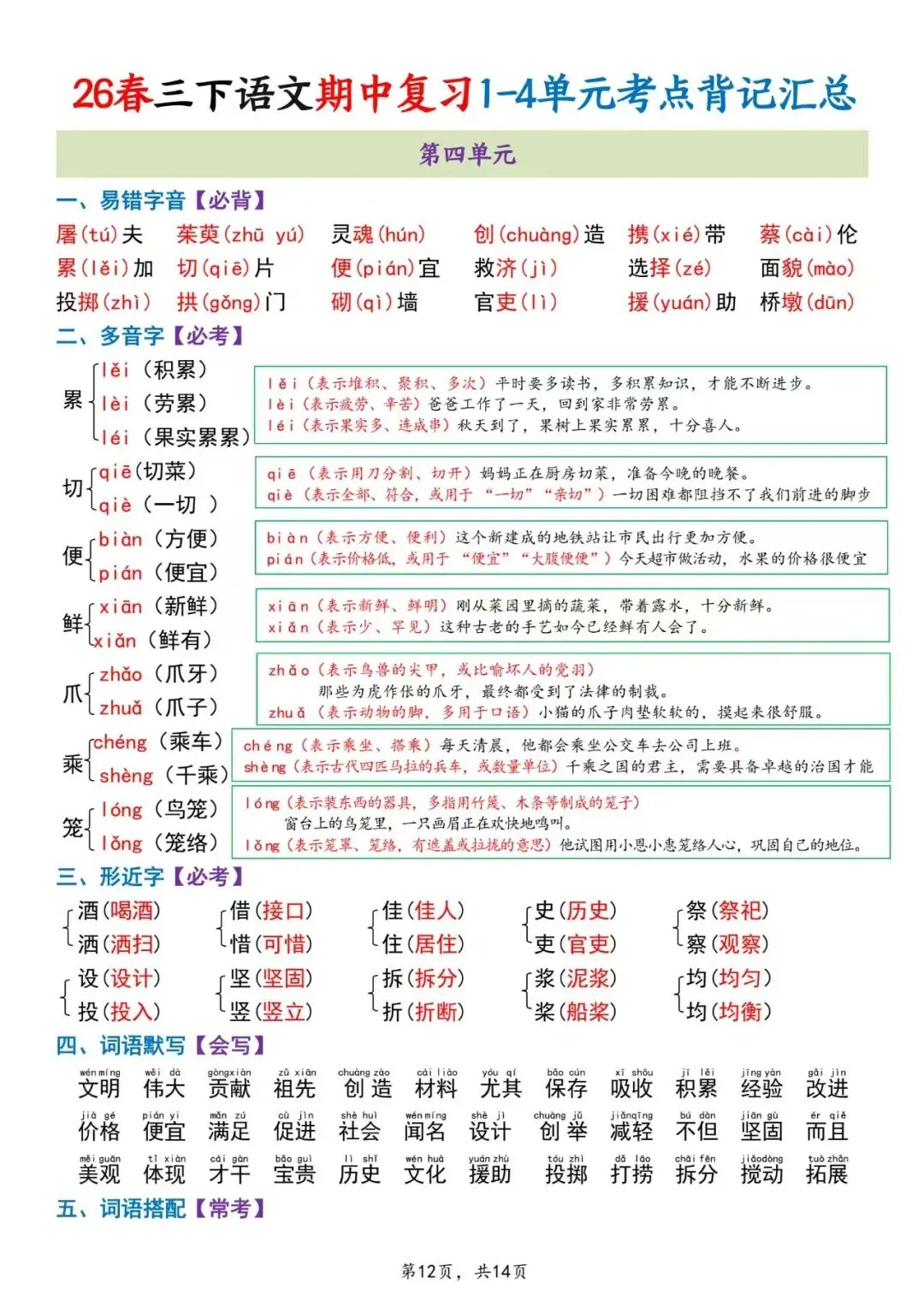 2026人教新版三年级下册语文期中复习资料(1-4单元)14页精华考点汇总 | 电子版可打印