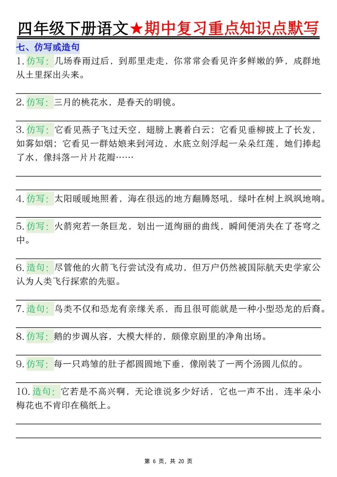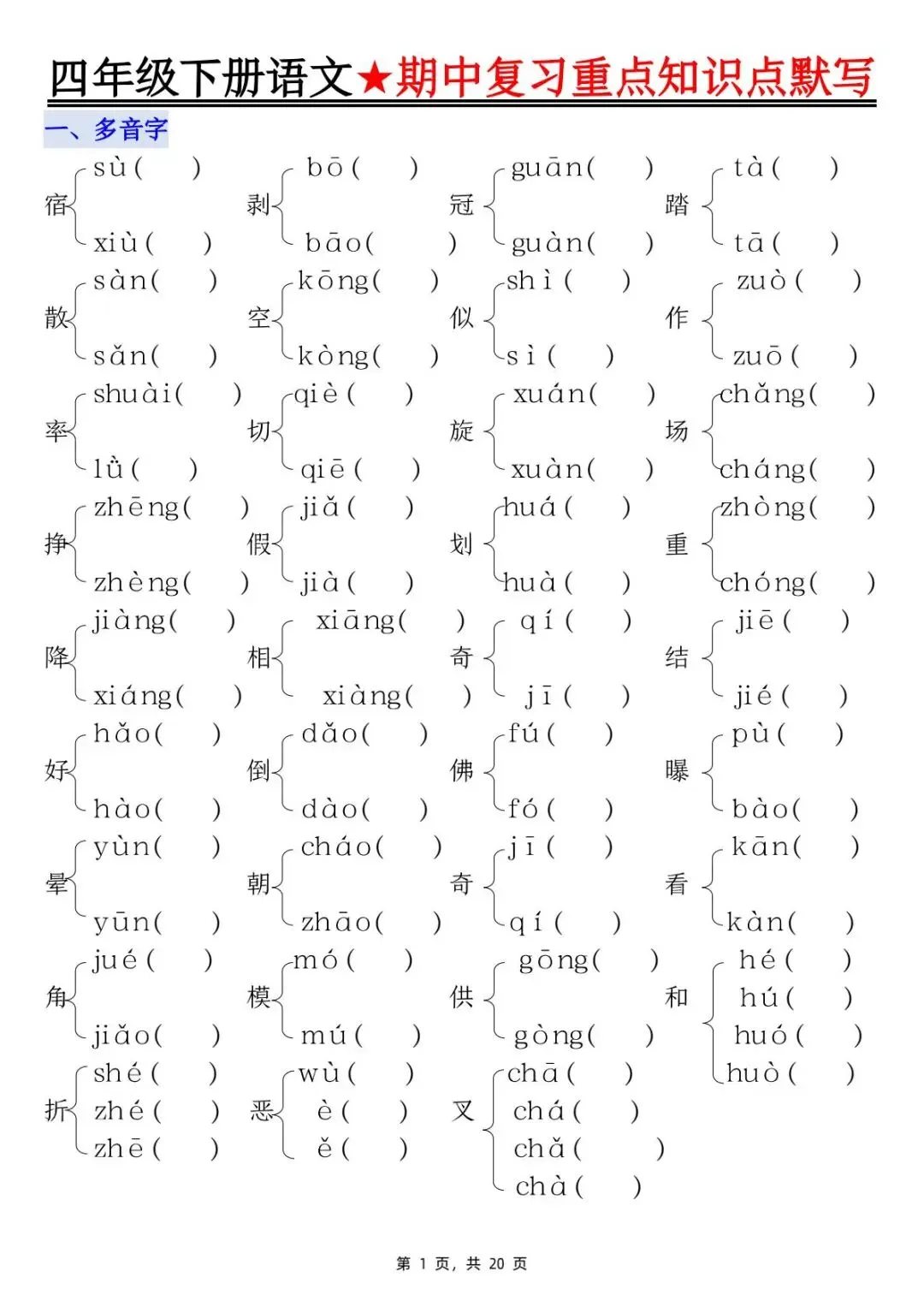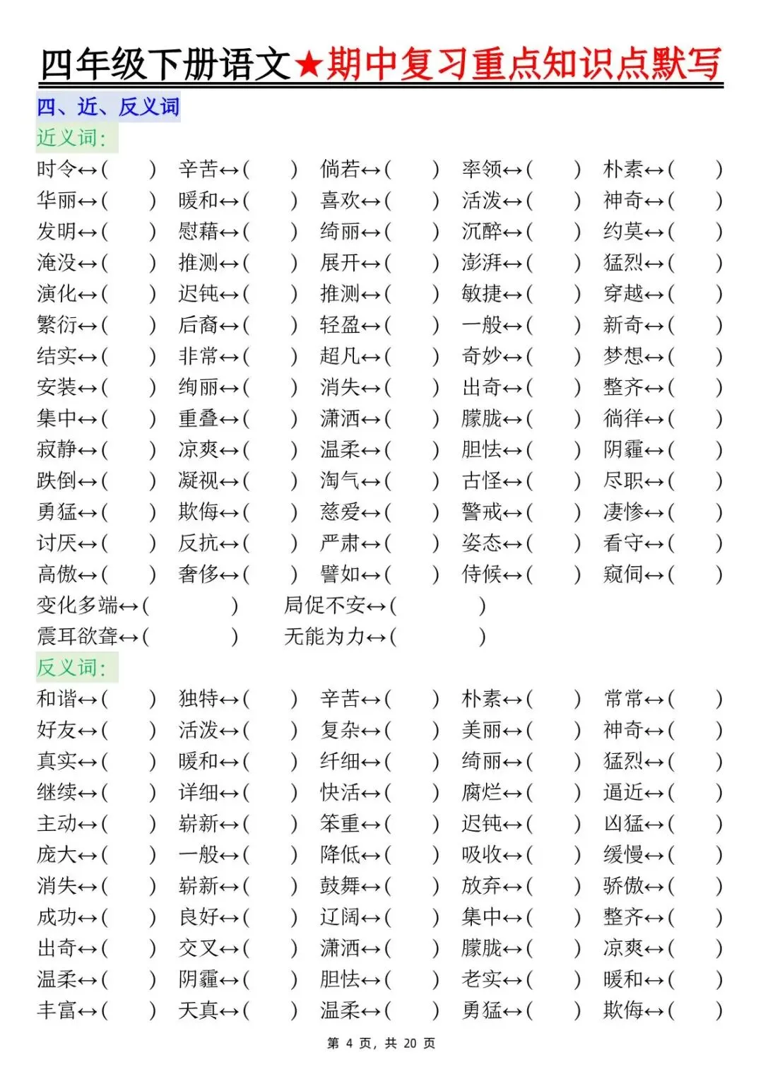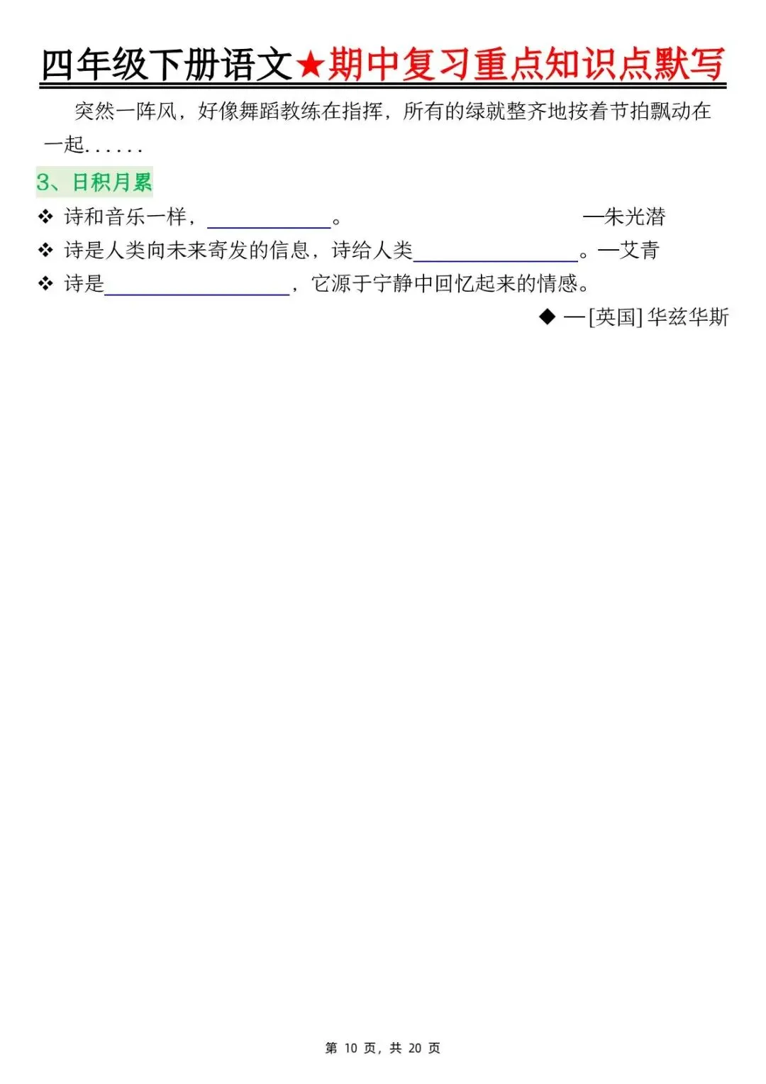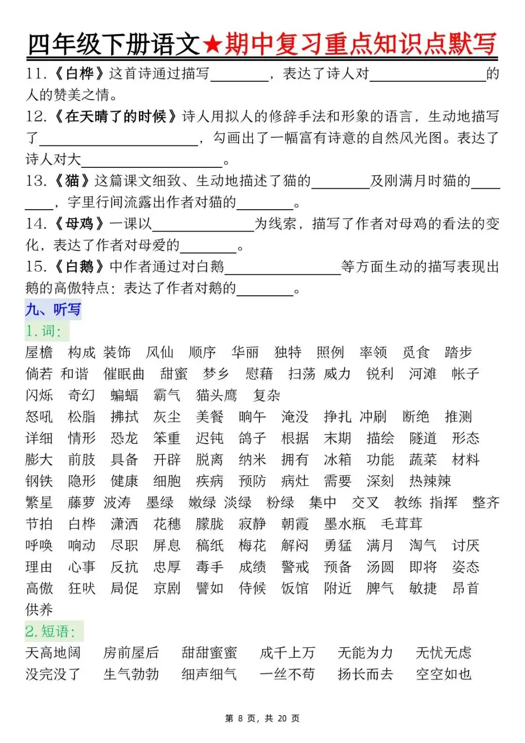 26年人教版四年级下册语文期中复习重点知识点汇总+默写,共20页,电子版可下载可打印