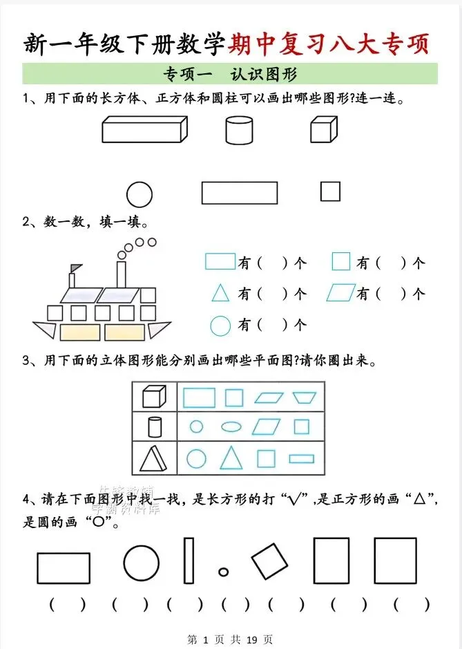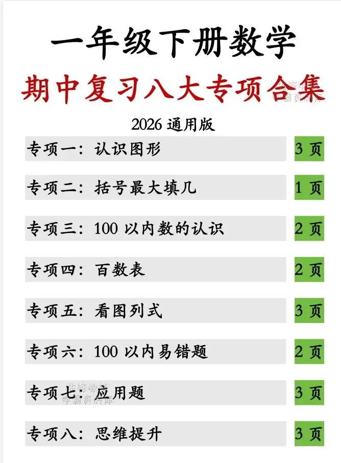 今天给大家整理了26春一年级下册数学期中复习八大专项,转发给朋友或班级群,受益更多人,帮助孩子学习!