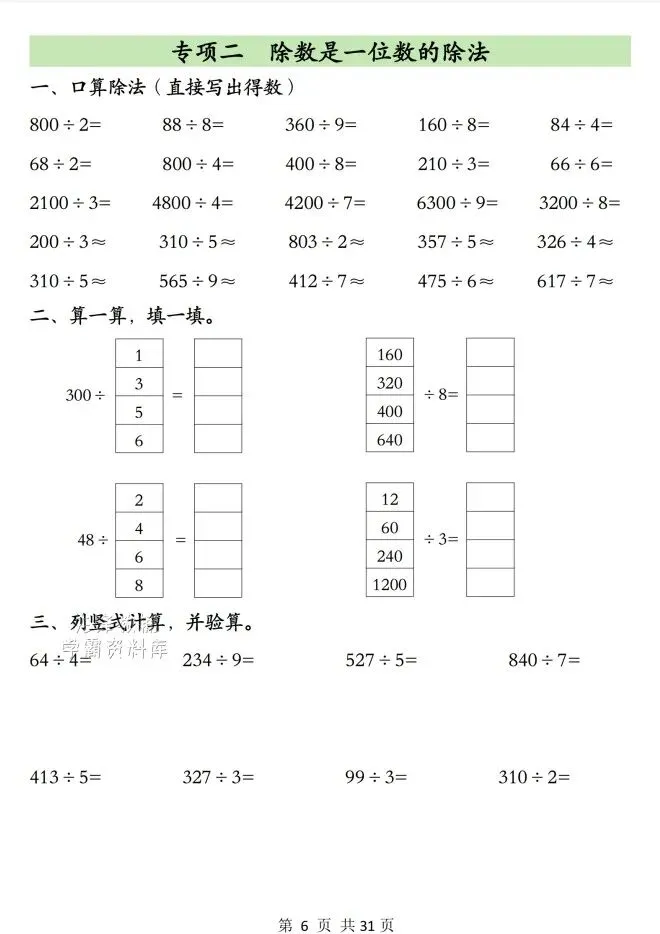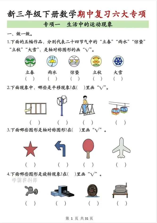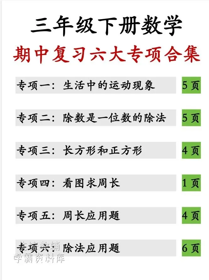 今天给大家整理了26春三年级下册数学期中复习六大专项,转发给朋友或班级群,受益更多人,帮助孩子学习!